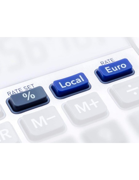 Pantalla LCD extragrande de 10 dígitos. Solar y a pilas. Con cálculo avanzado de porcentaje, conversión de moneda en euros. Cálculo de costo / venta / margen de beneficio, cálculo de margen, placa frontal de aluminio noble, azul. Acabado metálico. Pies de goma antideslizantes. Funciona con 1 pila LR1130. Medidas 101 x 149 x 28 mm. Peso 120 g.