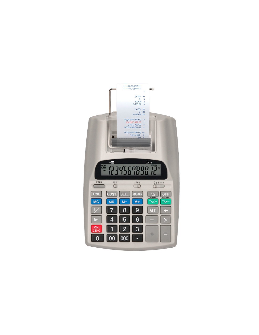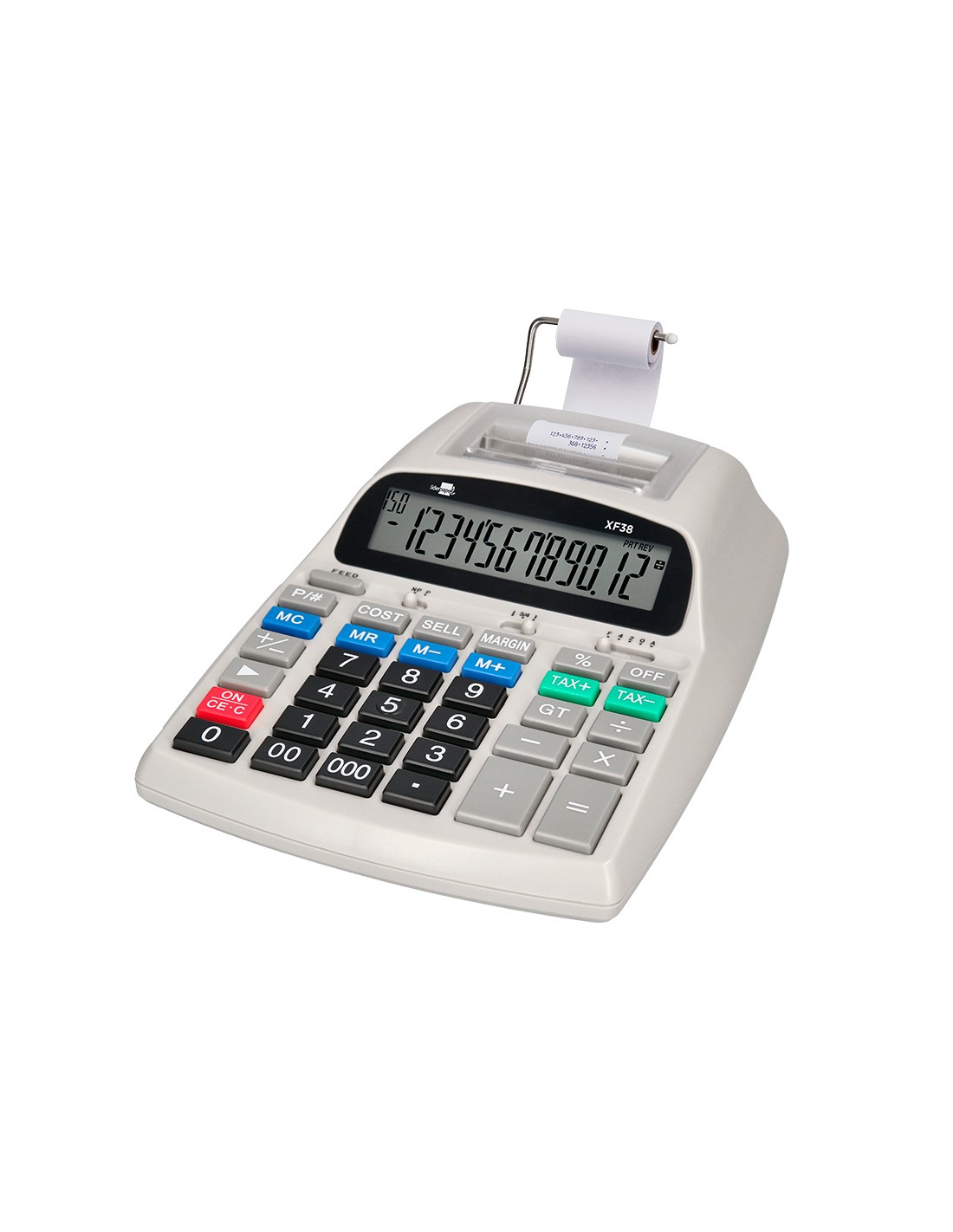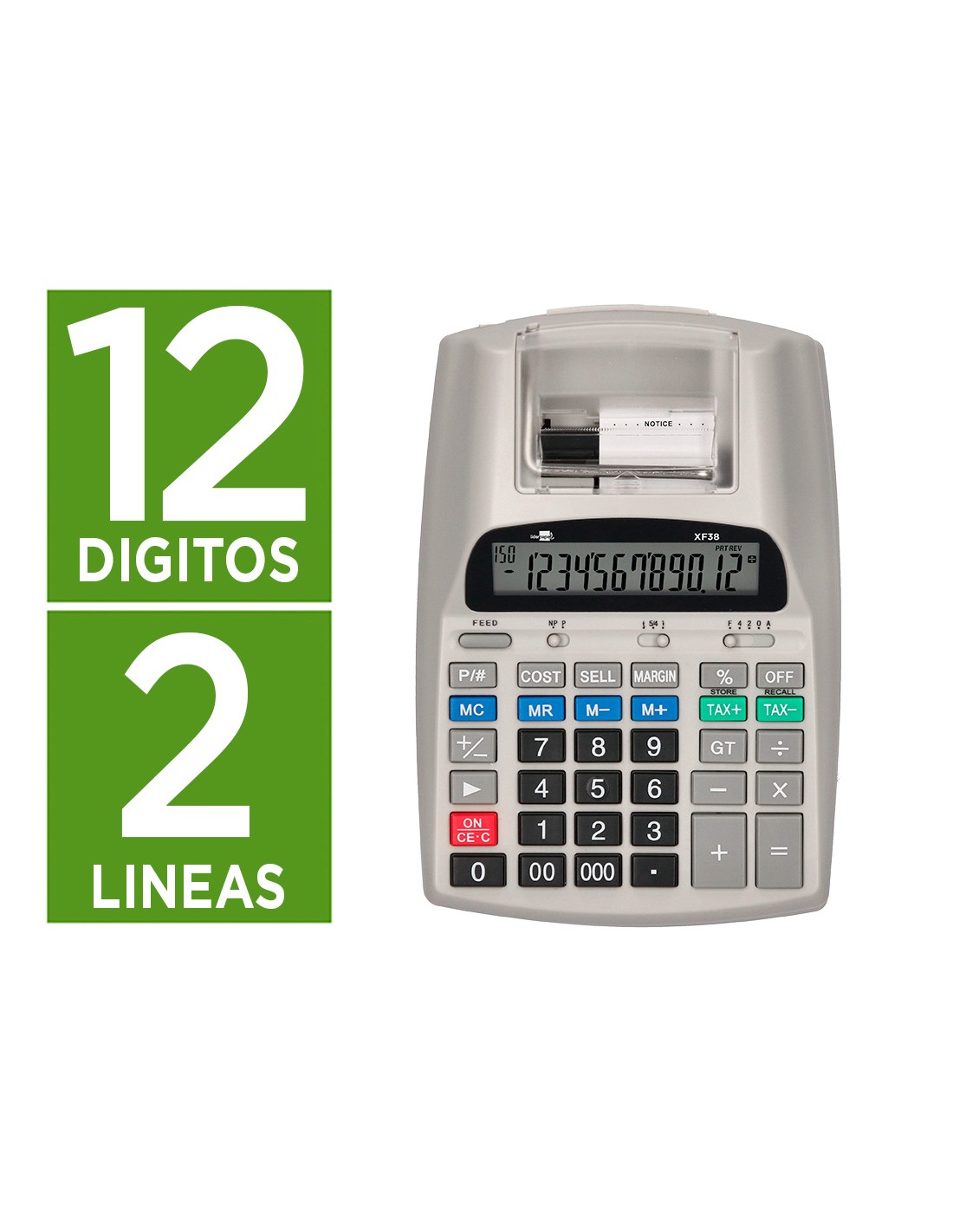 Calculadora impresora con pantalla de 12 dígitos. Utiliza rollo de papel de 57 mm de ancho por 25 mm de diámetro. Impresión en 2 colores. Con tecla de memoria, redondeo, tecla doble cero y triple cero, tecla programable de impuestos, margen de beneficio, precio de coste y precio de venta. Funciona con 4 pilas AA. Pilas incluidas. Medidas 225 x 158 x 56 mm. Peso 490 g.