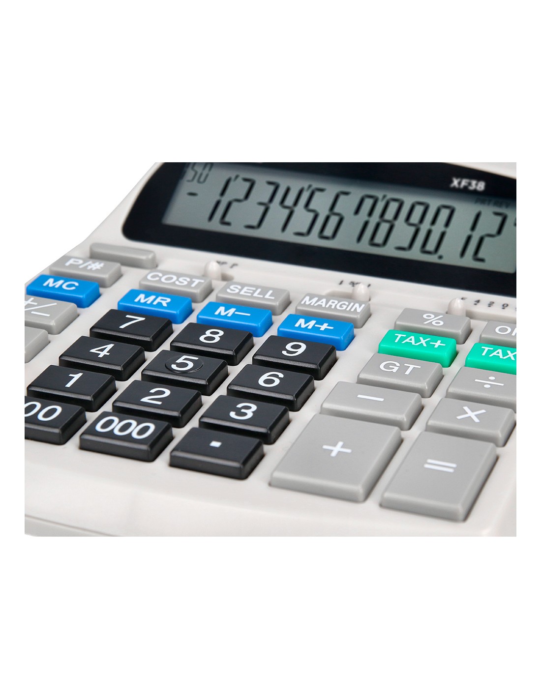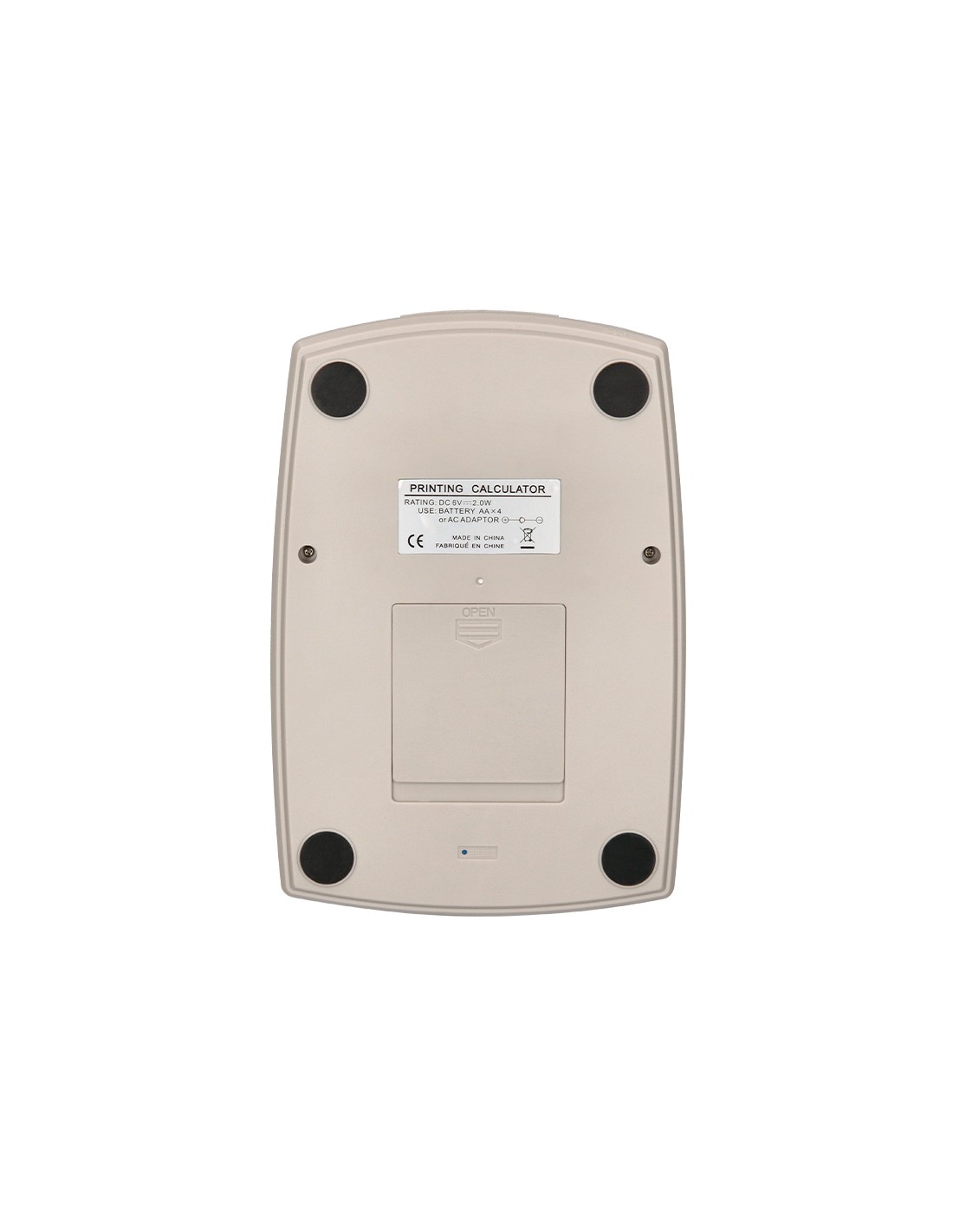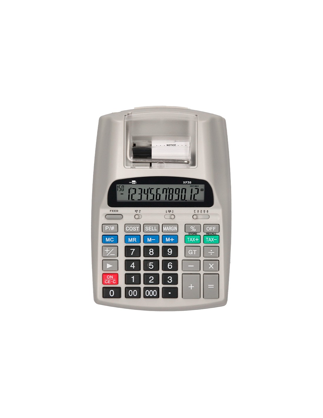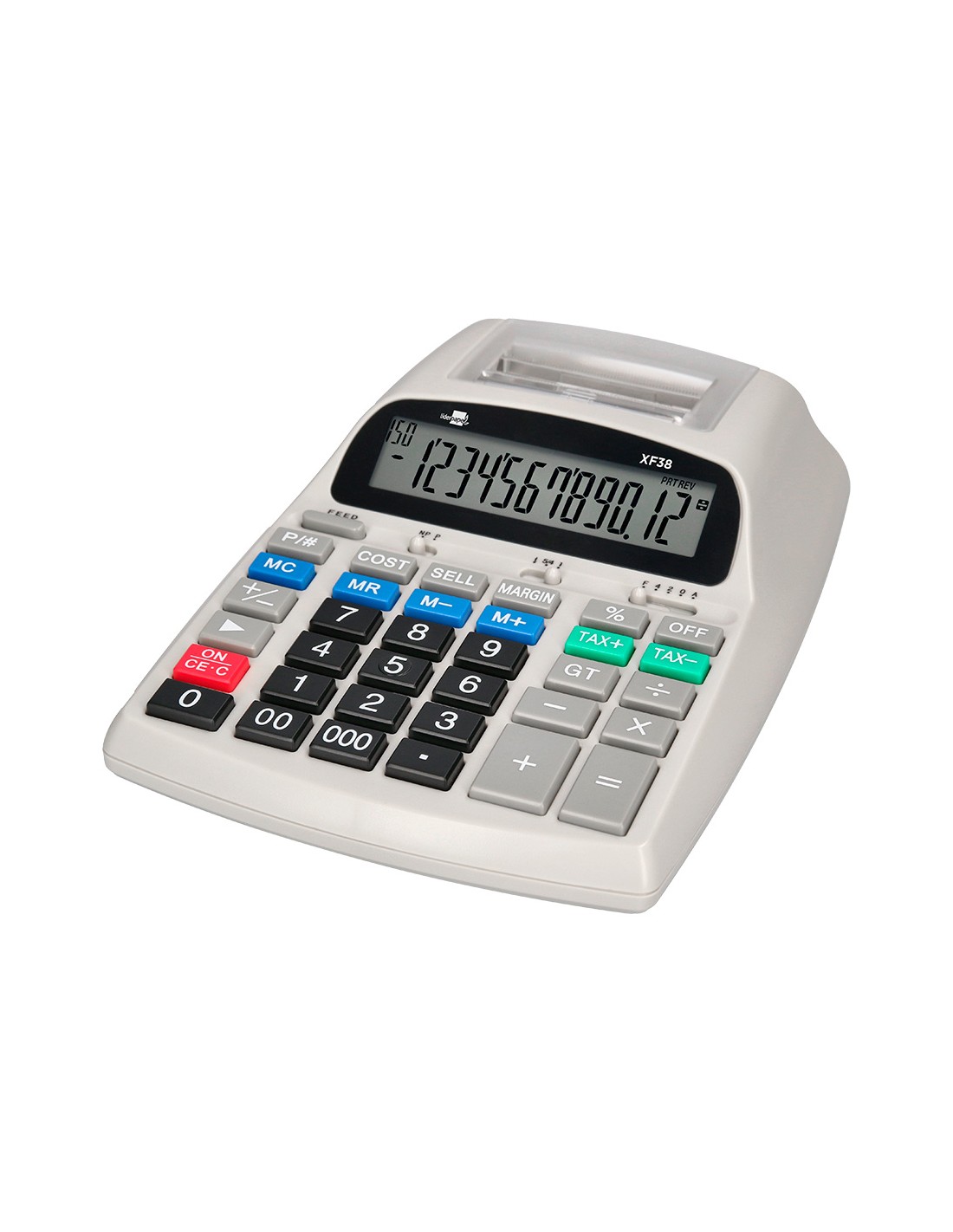 Calculadora impresora con pantalla de 12 dígitos. Utiliza rollo de papel de 57 mm de ancho por 25 mm de diámetro. Impresión en 2 colores. Con tecla de memoria, redondeo, tecla doble cero y triple cero, tecla programable de impuestos, margen de beneficio, precio de coste y precio de venta. Funciona con 4 pilas AA. Pilas incluidas. Medidas 225 x 158 x 56 mm. Peso 490 g.
