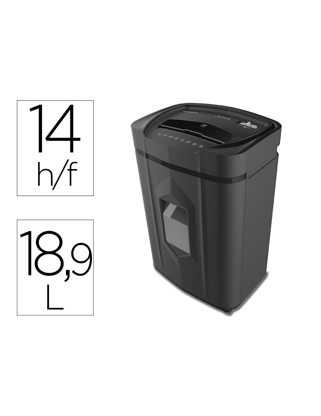 Destructora de uso frecuente. Capacidad de corte 14 hojas. Corte en partículas de 4 x 25 mm. Nivel de seguridad P-4. Sistema antiatascos. Tapa de seguridad. Destruye clips, grapas, CD y tarjetas de crédito. Papelera de 18,9 litros. Medidas 366 x 491 x 280 mm. Peso 12,5 kg.