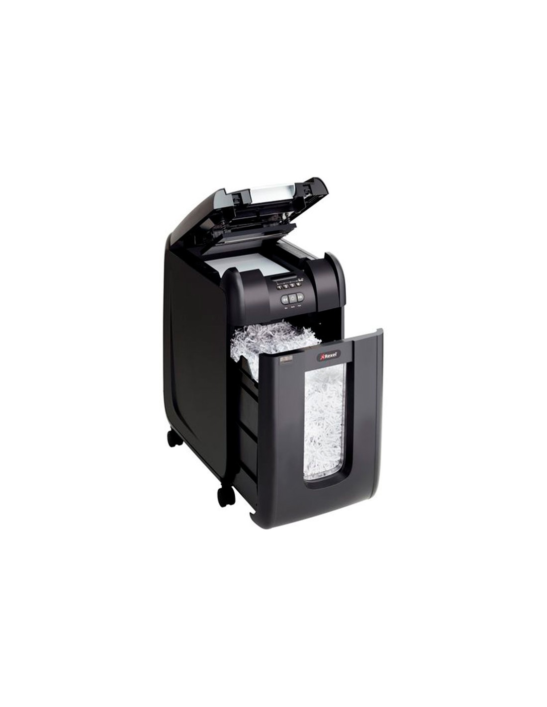 Destructora de corte en partículas. Tritura automáticamente hasta 300 hojas de papel DIN A4 (80 g/m²) a la vez y hasta 10 hojas manualmente. Nivel de seguridad P-4. Esta destructora de alimentación automática es una trituradora de oficina sofisticada, con una papelera extraíble de 60 litros. No es necesario alimentar manualmente el papel, ni quitar grapas y clips de papel primero. Medidas 415 x 806 x 465 mm. Peso 21 kg.