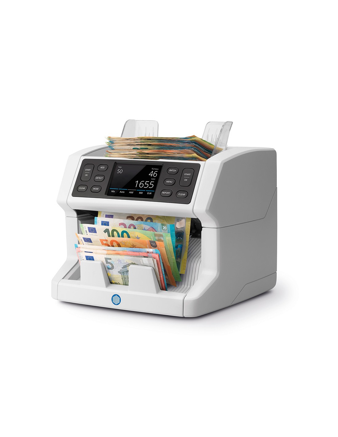 Contadora totalizadora de billetes ordenados o mezclados. 10 divisas. Detección de billetes falsos en 7 puntos. 100% testada BCE y BOE. Pantalla táctil y menú multilingüe, notificaciones y apertura panel superior para mantenimiento, puerto USB para actualizaciones. Velocidad 1.200 billetes/minuto.