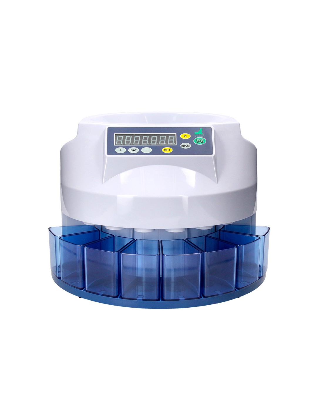 Dos modalidades de conteo. Libre cuenta todas las monedas que están en la bandeja de entrada sin parar, hasta que una de las bandejas de salida esté llena. Con este modo la máquina predetermina por sí sola el número de lote. Conteo por lote cuenta el lote de monedas del mismo valor que se ha predeterminado previamente. El resultado que da el contador es la cantidad de monedas y el valor que suponen. Velocidad de conteo 216 uds./minuto. Capacidad de la bandeja de entrada 300 - 500 uds. Capacidad de la bandeja de salida 80-150 uds. Lote en pantalla 3 dígitos LED. Número de conteo en pantalla 4 dígitos LED. Medidas 355 x 266 x 330 mm. Peso neto 4,5 kg.