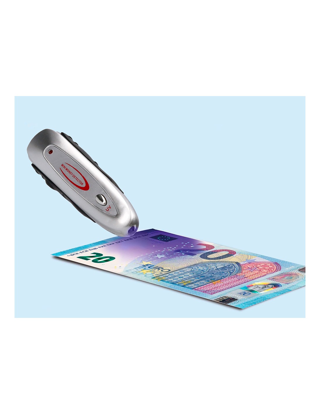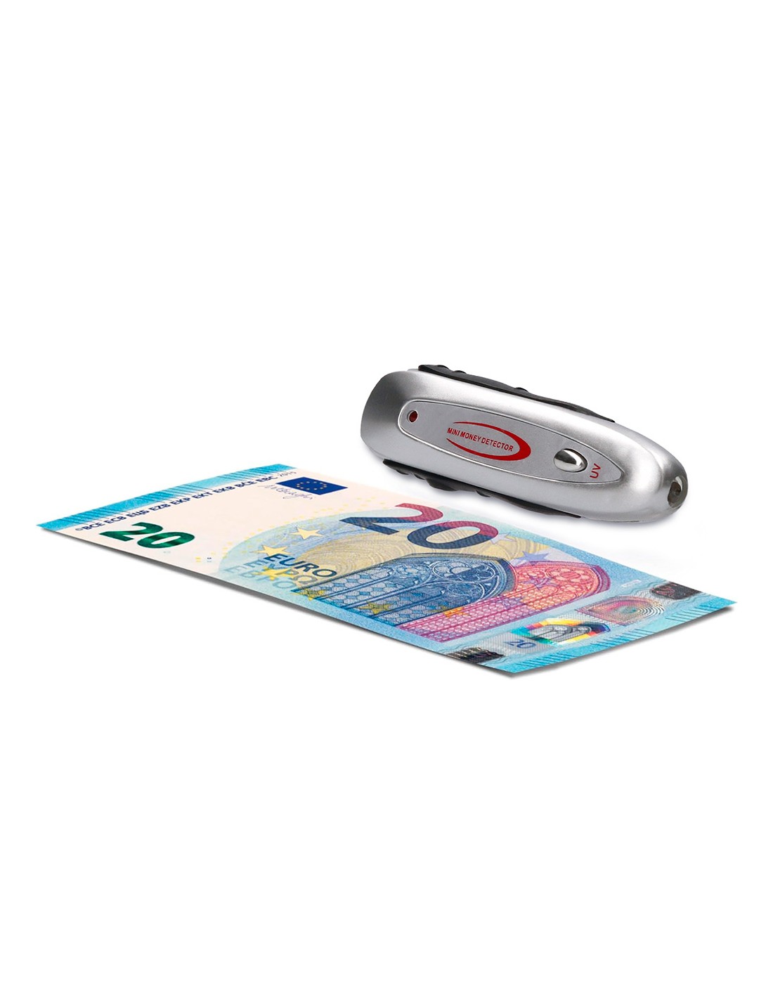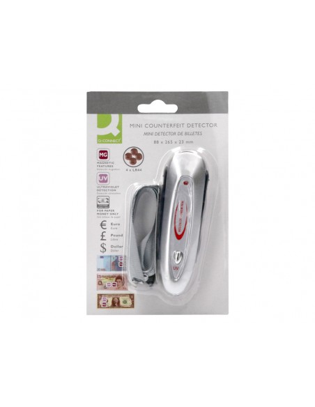Detector portátil de billetes falsos muy práctico por su pequeño tamaño. Incluye una cinta para llevarlo colgado. Pilas incluidas. Medidas 88 x 265 x 23 mm. Peso 0,7 kg.
