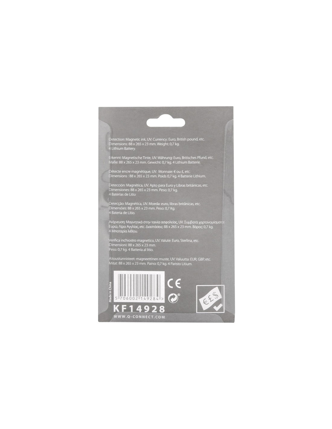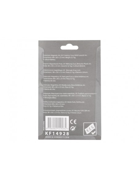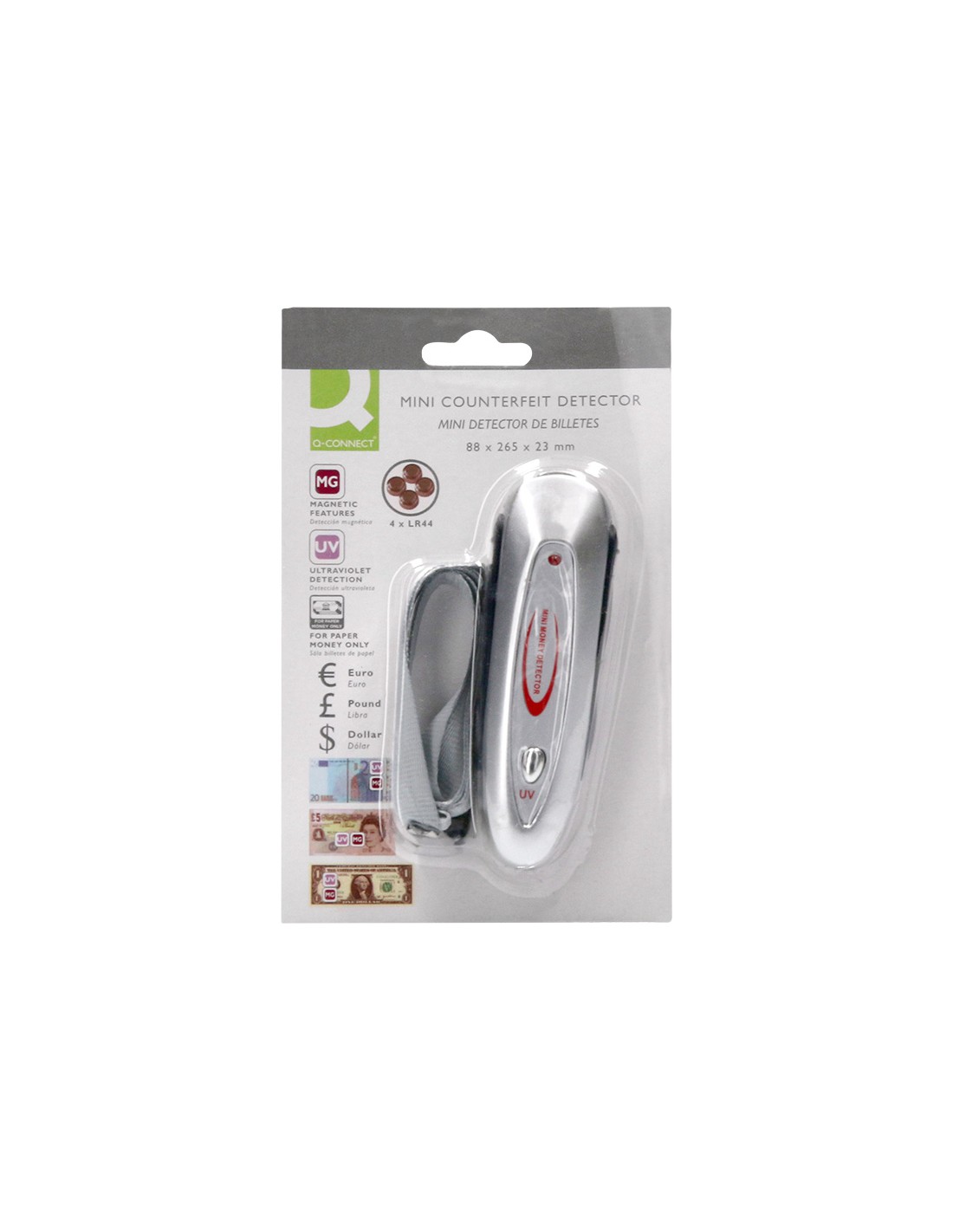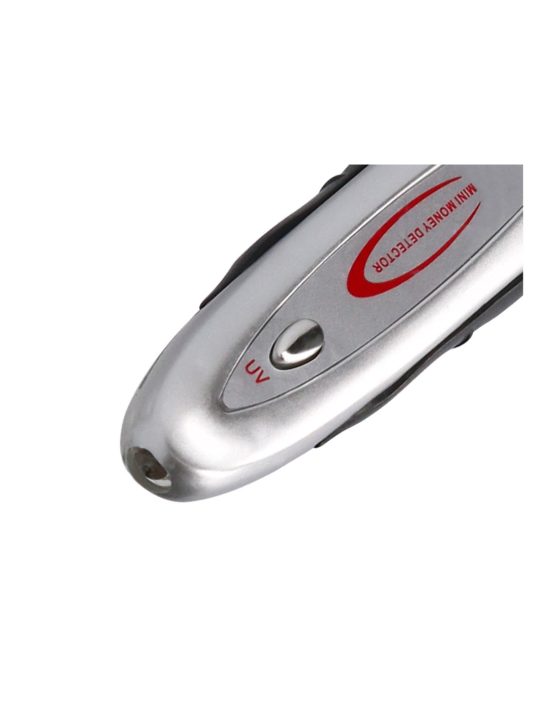 Detector portátil de billetes falsos muy práctico por su pequeño tamaño. Incluye una cinta para llevarlo colgado. Pilas incluidas. Medidas 88 x 265 x 23 mm. Peso 0,7 kg.