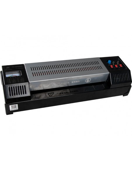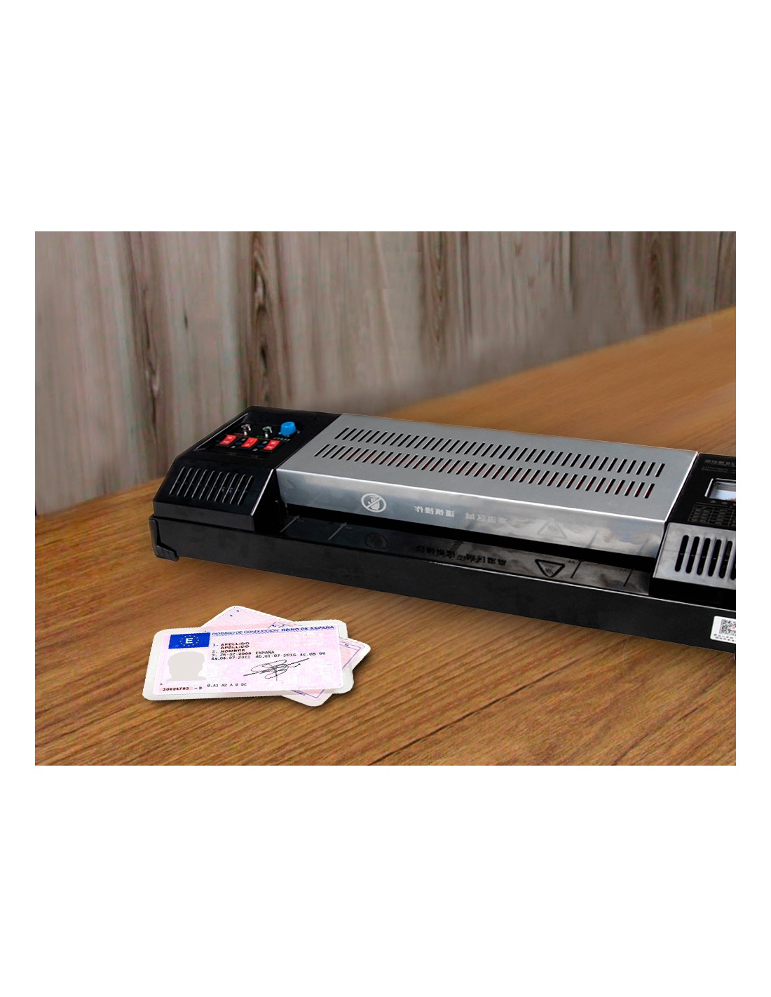Plastificadora de uso profesional. 4 rodillos. Marcha hacia delante y hacia atrás. Interruptor de encendido y motor independientes. Funcionamiento en caliente, con regulador de temperatura de 75 a 200 ºC. Espesor máximo < 1 mm. Adecuada para plastificar papel DIN A4 y DIN A3. Utiliza fundas desde 100 hasta 200 micras. Tiempo de calentamiento 2-3 minutos. Medidas 535 x 195 x 115 mm.