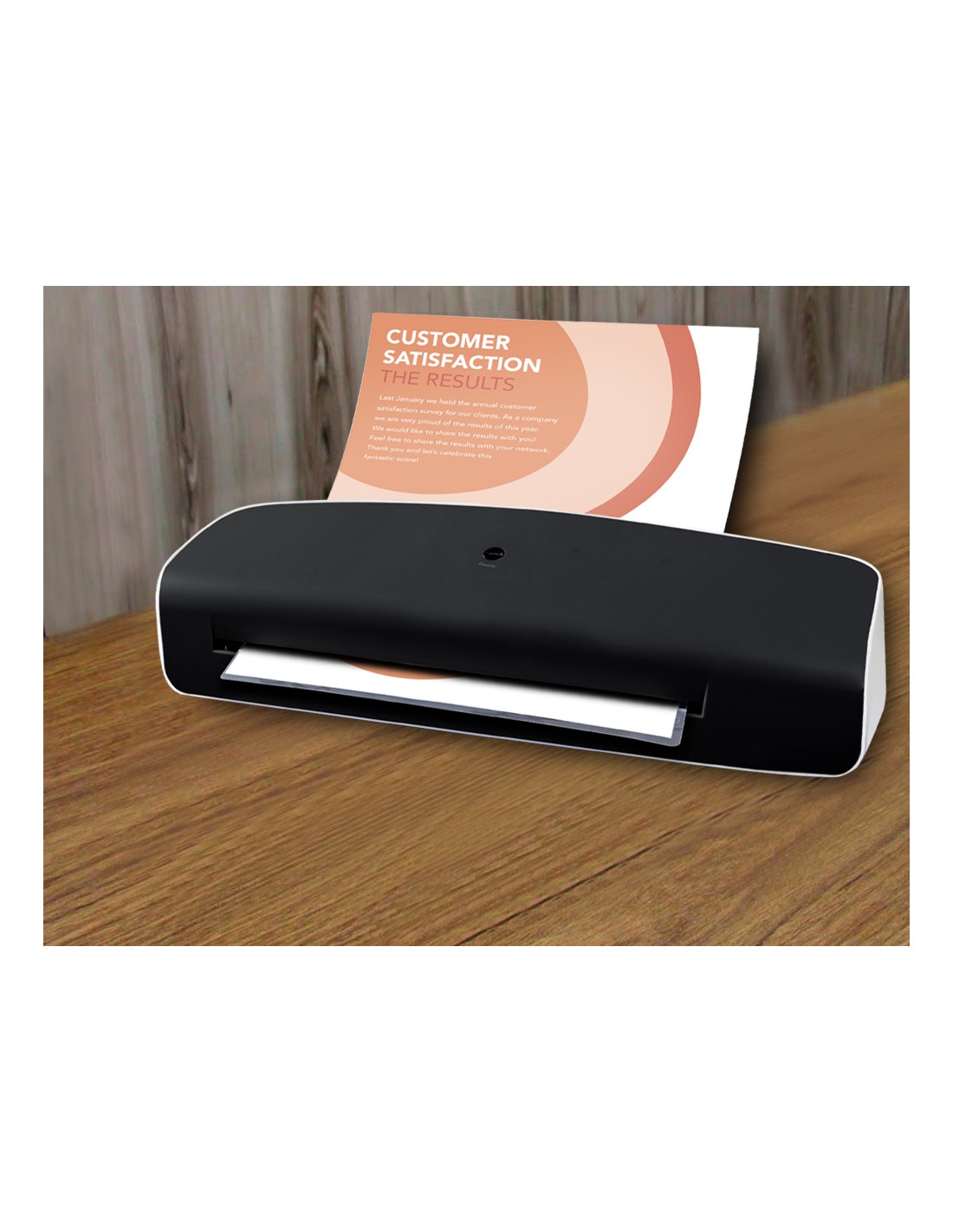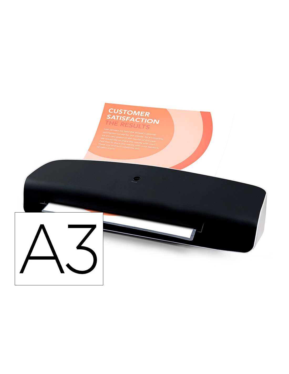 Tecnología de 2 rodillos calientes. Tiempo de calentamiento de 2 minutos y alcanza temperaturas entre 110 y 135 C. Utiliza fundas de hasta 125 micras. Velocidad de plastificación 400 mm/min. Incluye sistema liberador de rodillos antiatasco. Cuerpo de ABS. Adecuado para plastificación de papel formato DIN A3 de hasta 160 g/m². Medidas 441 x 121 x 76 mm. Peso 1,4 kg.