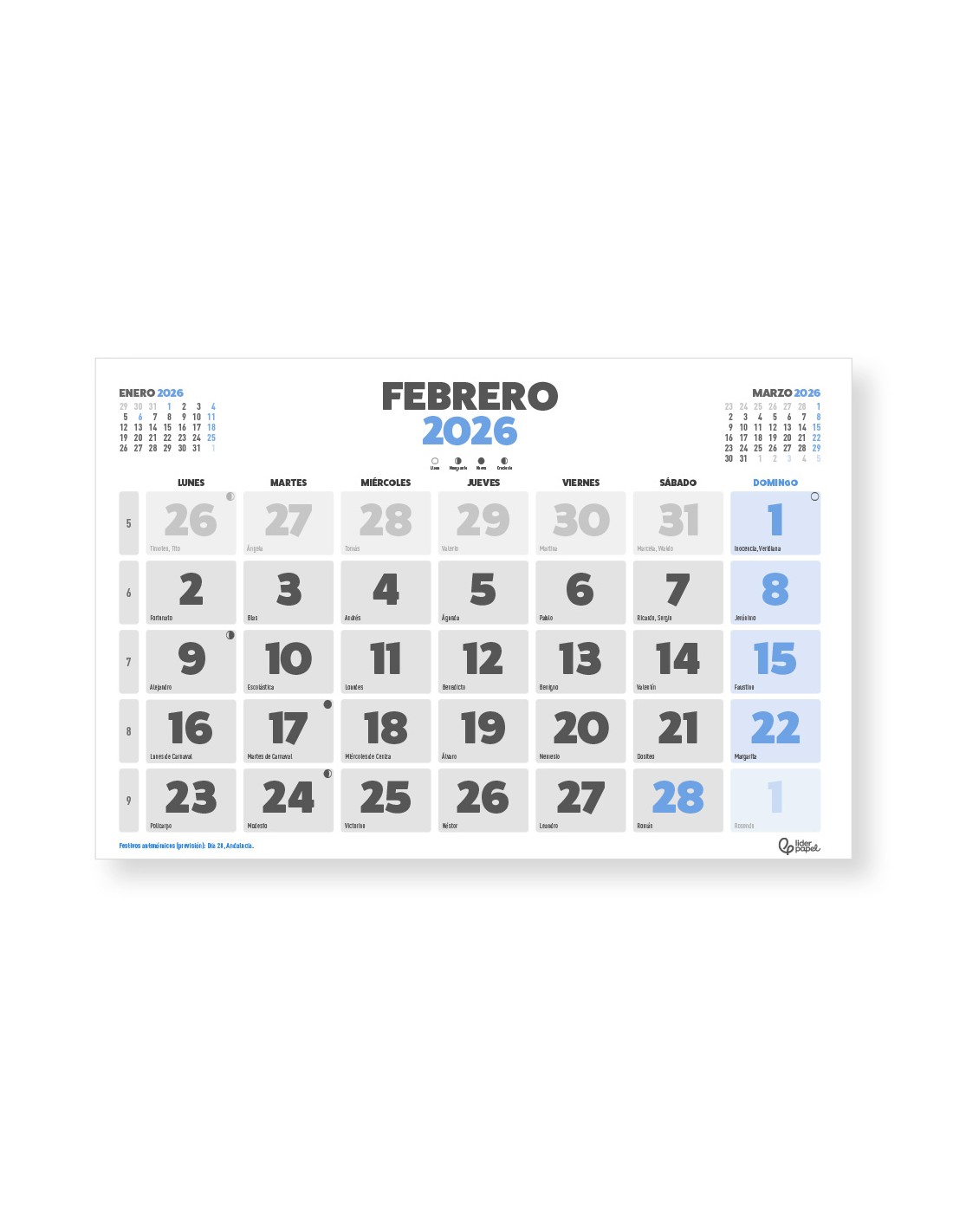 Calendario pared liderpapel clasico 2026 lomo engomado 30x30 cm papel 105 gr