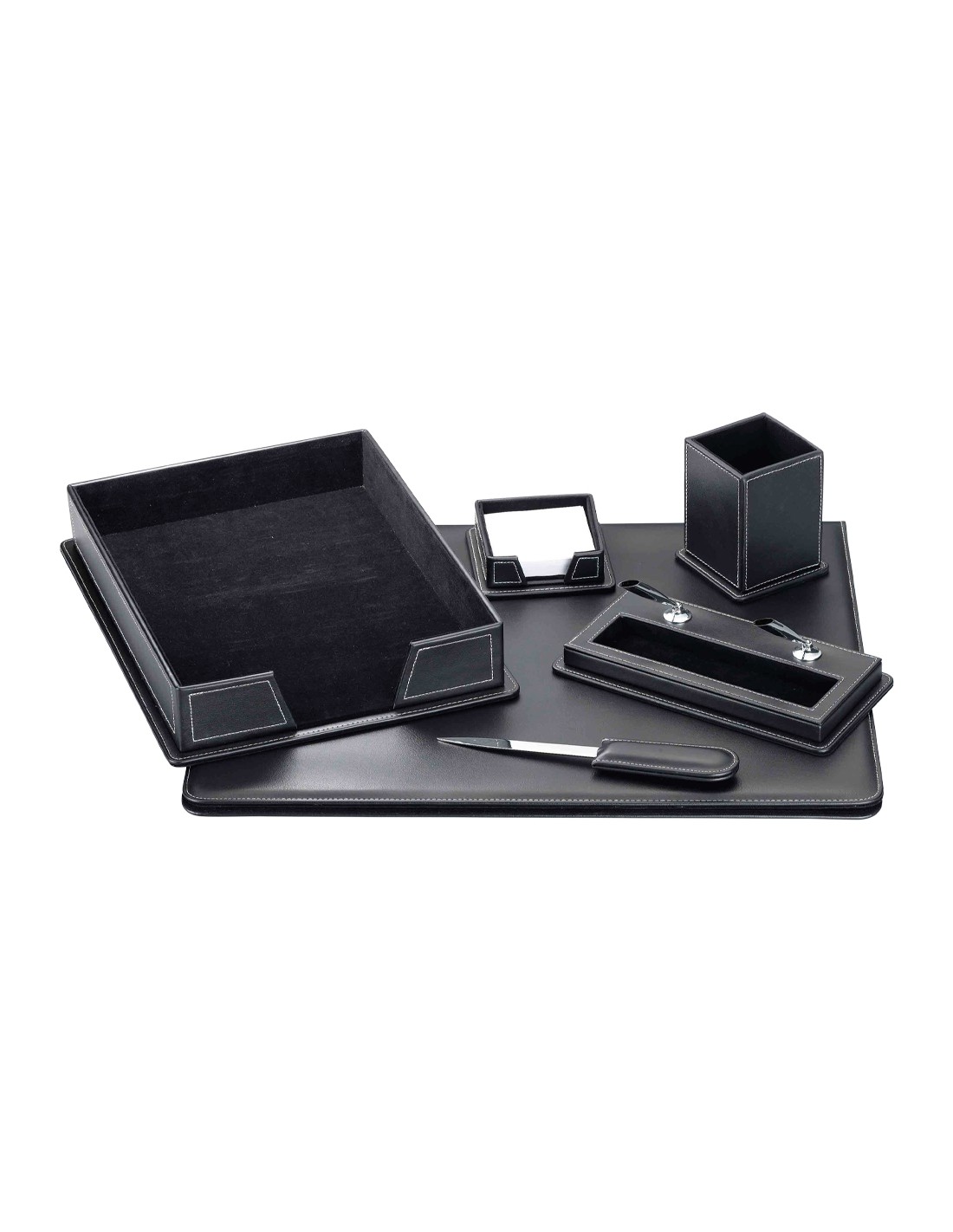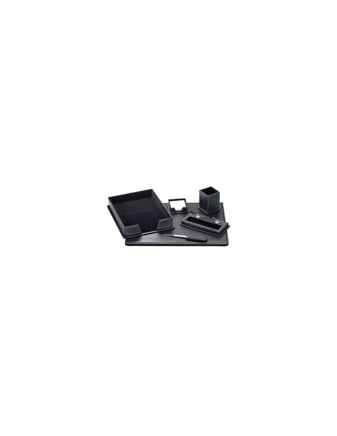 Juego de escribanía y accesorios para sobremesa. Fabricado en símil piel. Contiene 6 piezas vade doble plegado al centro, abrecartas, soporte para taco de papel, cubilete portalápices, portabolígrafos y bandeja portadocumentos. Color negro. Medidas 500 x 400 x 10 mm.