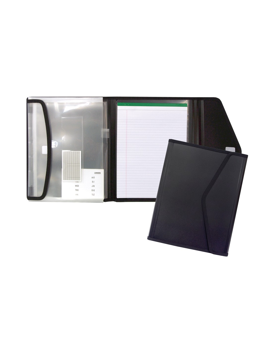 Carpeta portafolios fabricada en polipropileno. En la parte izquierda contiene 5 departamentos y una carpeta sobre para guardar más documentos. En la parte derecha contiene bloc de notas. Cierre de velcro. Formato DIN A4. Color negro. Medidas 270 x 330 x 24 mm.