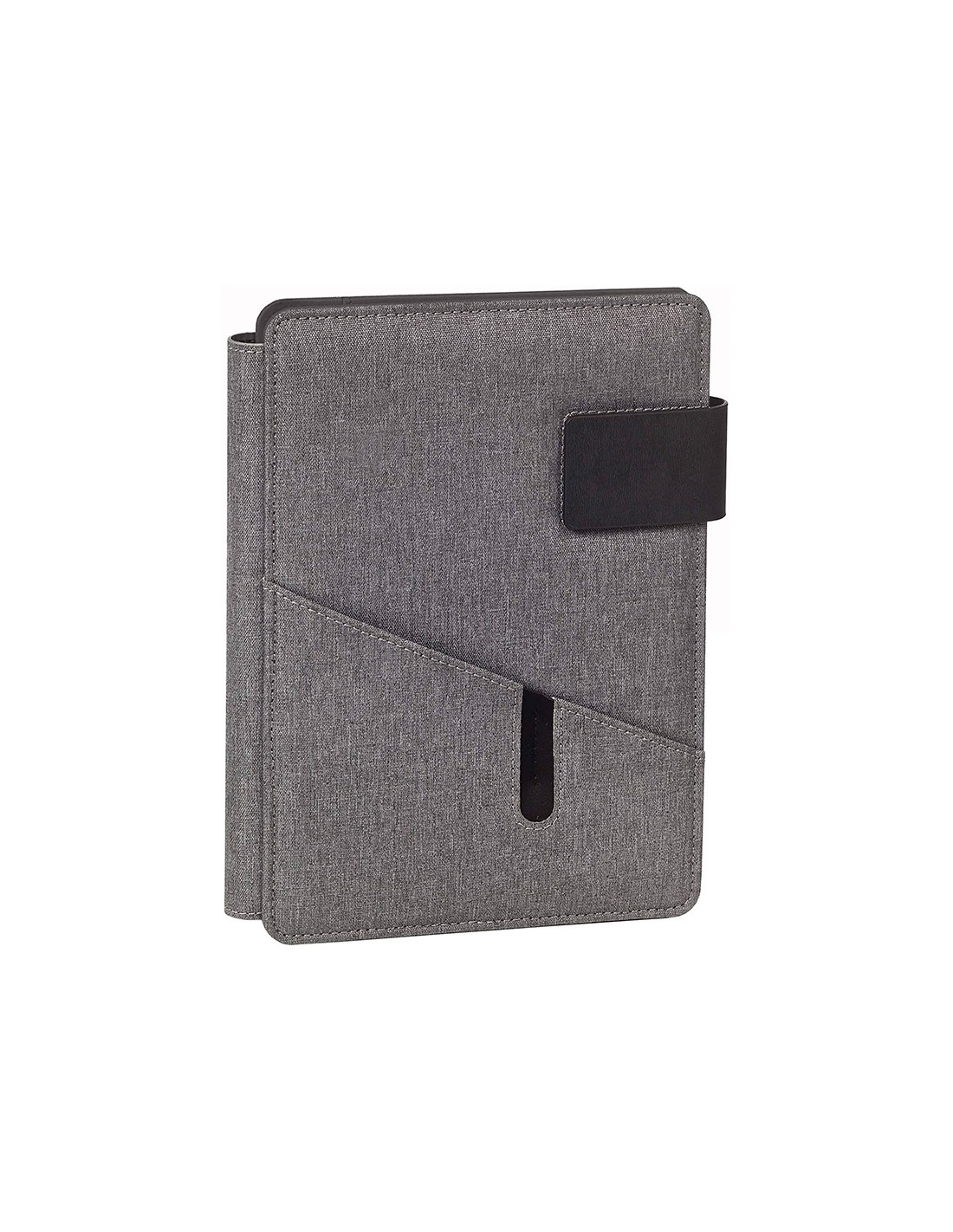 Carpeta para documentos. Incluye soporte tipo atril para Smartphone o tablet. Múltiples bolsillos elásticos para accesorios de diferentes dimensiones. Incluye un cuaderno de 80 g/m². Cierre de trabilla con imán oculto. Color gris. Formato DIN A5.
