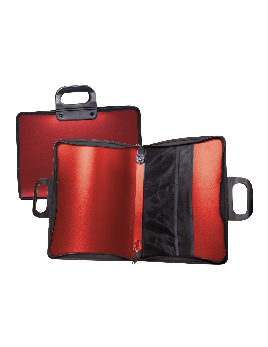 Cartera fabricada en polipropileno de alta calidad. Flexible y resistente. Lomo de 45 mm. Compartimento interior para documentación. Cómoda asa fabricada en plástico. Cierre con cremallera. Color rojo. Medidas 400 x 45 x 300 mm.