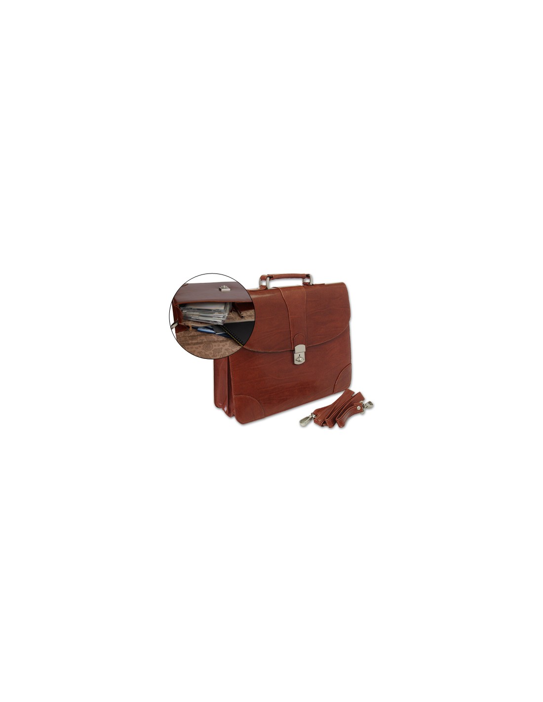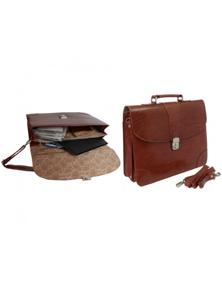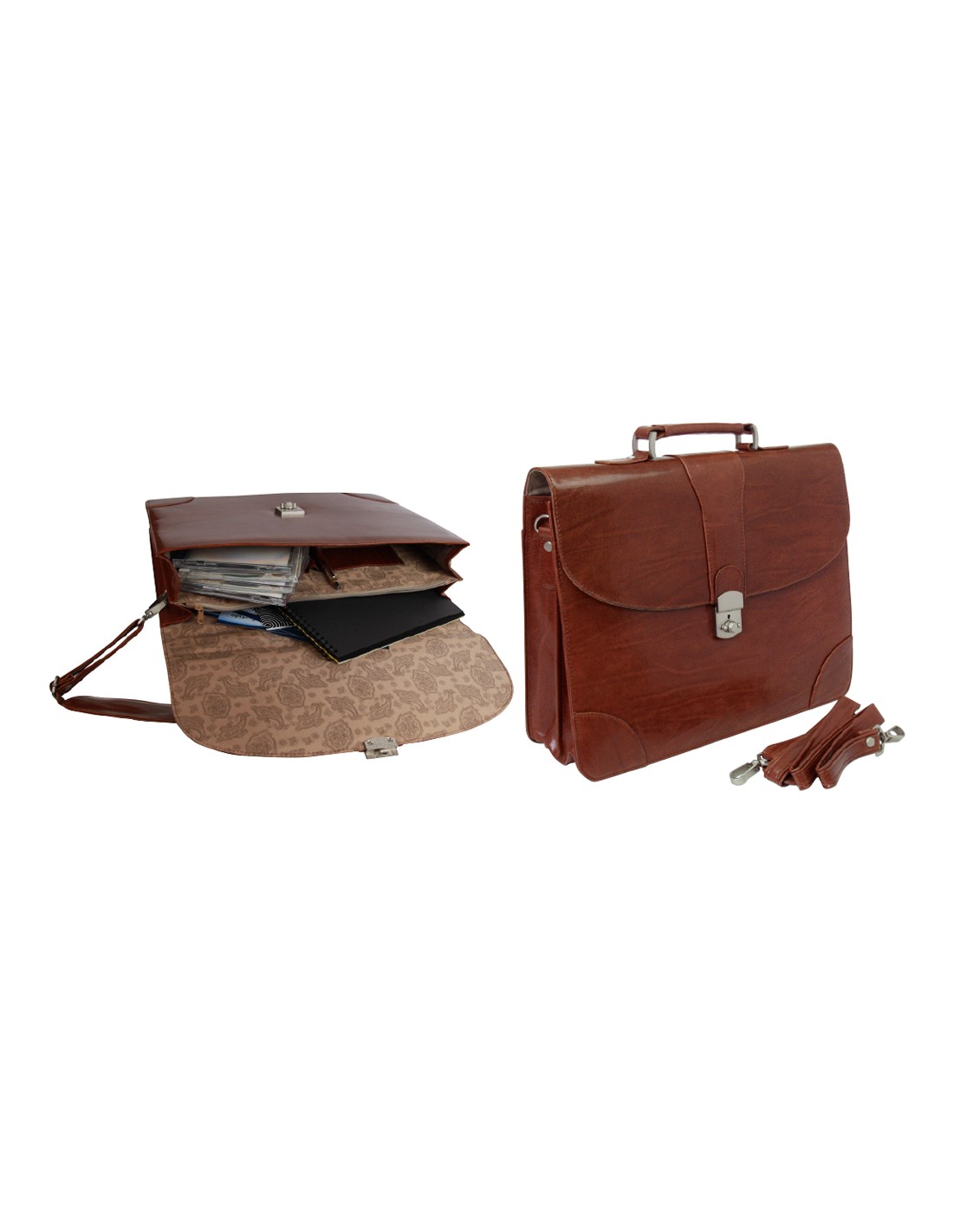 Fabricada en polipiel. Cierre metálico con llave. Asa y cinta bandolera, tres departamentos interiores, uno con cremallera. Soporte para bolígrafos y tarjetas. Color marrón con detalles en plata. Medidas 406 x 318 x 79 mm.