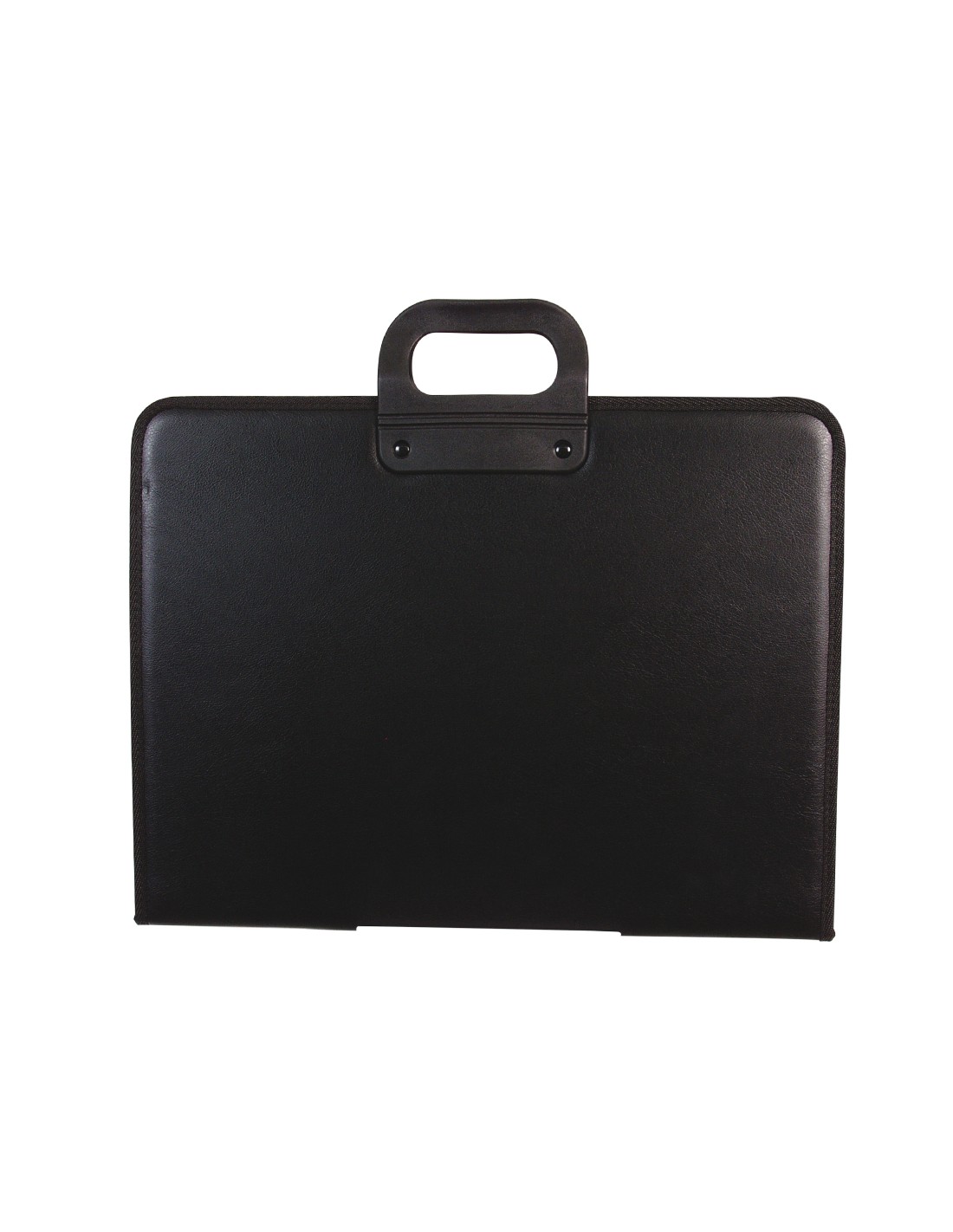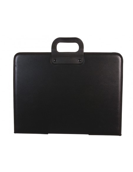 Cartera fabricada en PVC. Cierre de cremallera. Con asa para facilitar su transporte. Color negro. Formato DIN A3. Medidas 465 x 360 x 40 mm.