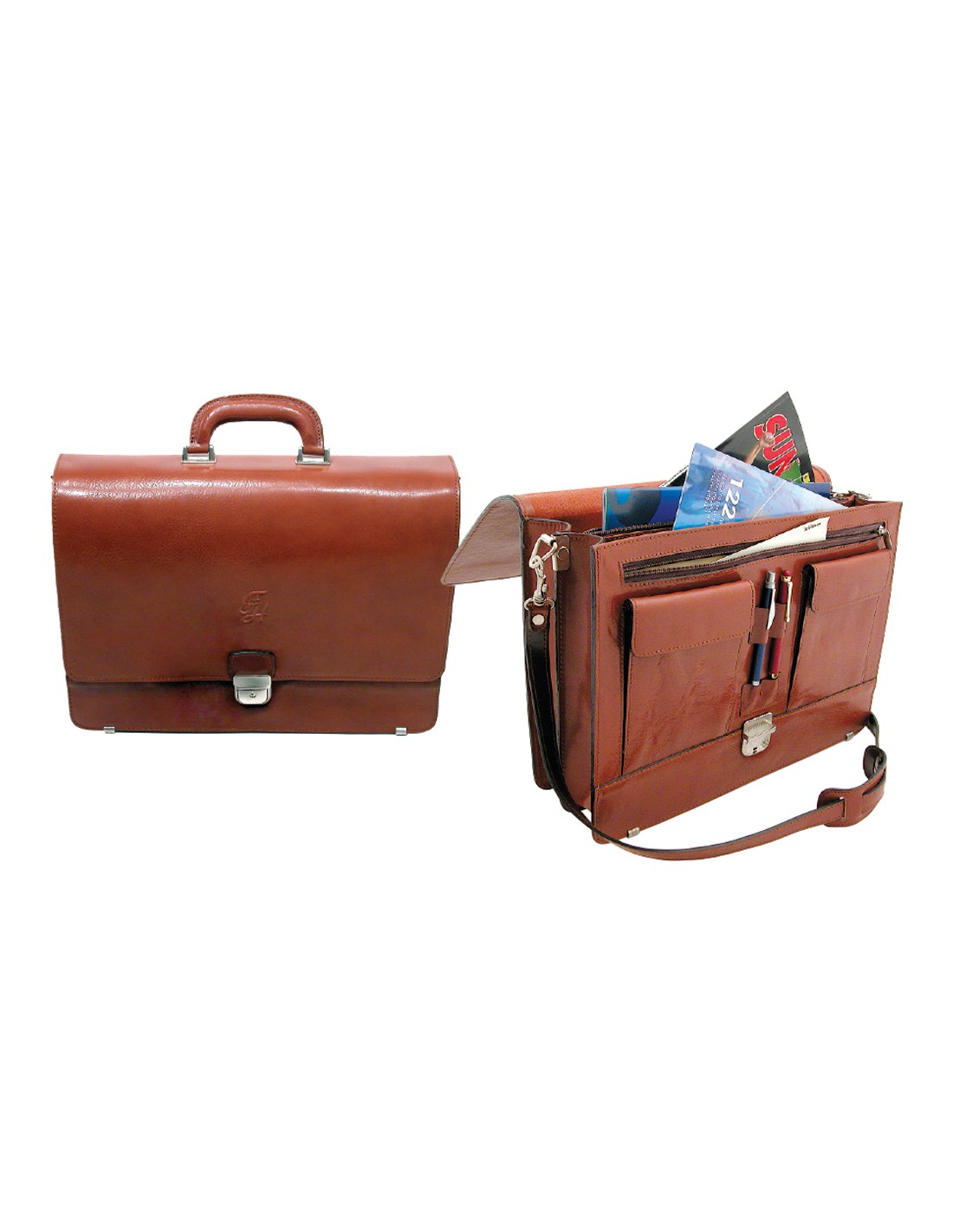 Fabricada en piel legítima de primera calidad. Cierre metálico con llave, interior con tres departamentos para documentación, uno con cremallera, departamentos con tarjeteros y soporte para bolígrafos. Parte delantera con bolsillo de cremallera y dos bolsillos con solapa y cierre con imán. Parte posterior con bolsillo con cremallera. Color marrón con detalles en plata. Fabricado en Ubrique, España. Medidas 403 x 300 x 105 mm.