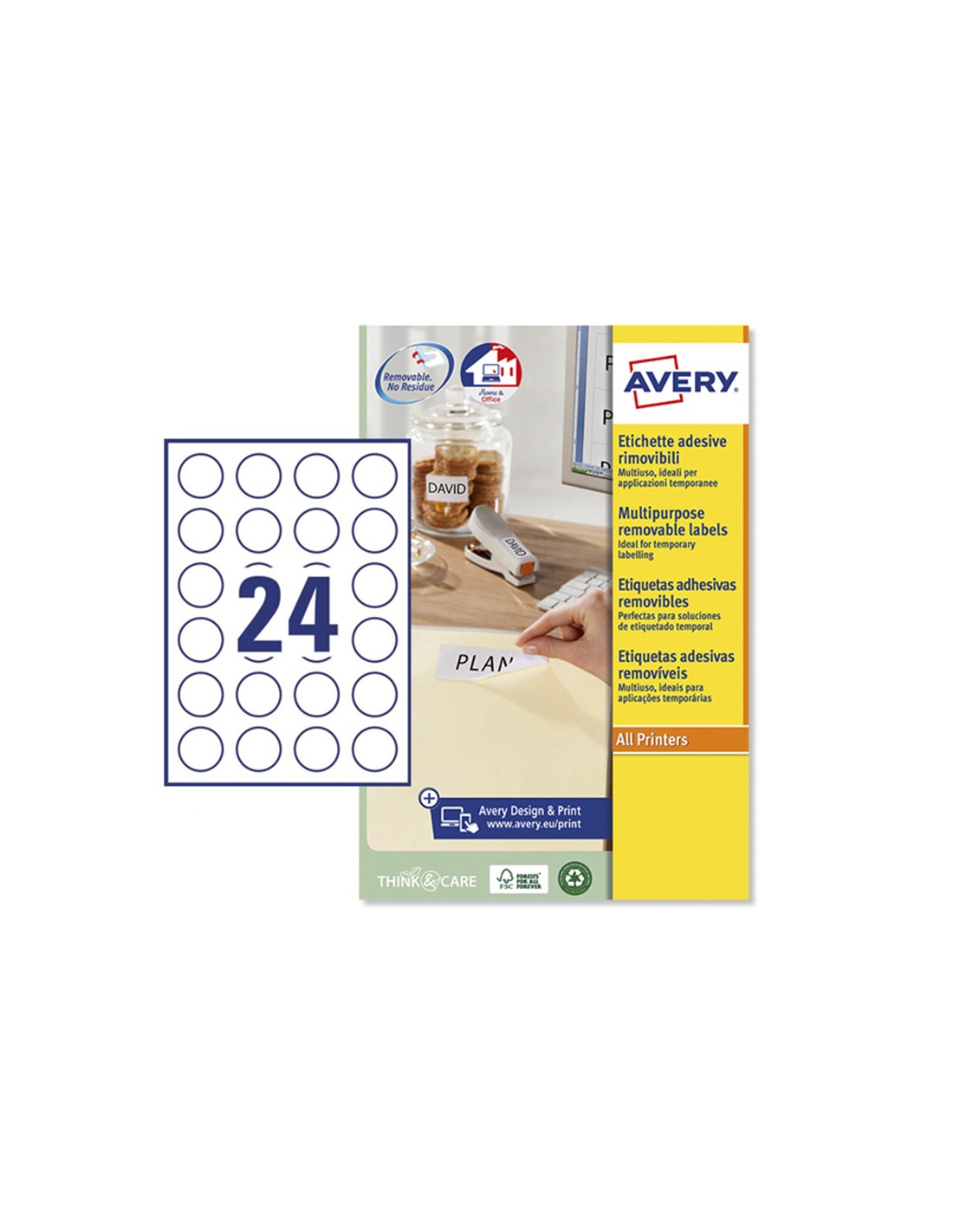 Etiquetas adhesivas blancas removibles. Perfecta para un etiquetado temporal. Ideales para etiquetar productos y sobre El adhesivo no deja residuo de pegamento sobre la superficie. Ideales sobre productos y precios. Compatibles con impresoras ink-jet, láser y fotocopiadoras. Hechas de material proveniente de bosque certificado FSC. Caja de 20 hojas. Se puede utilizarel software crea e imprime gratuito de Avery para realizar el diseño de l as etiquetas con pocos clics.