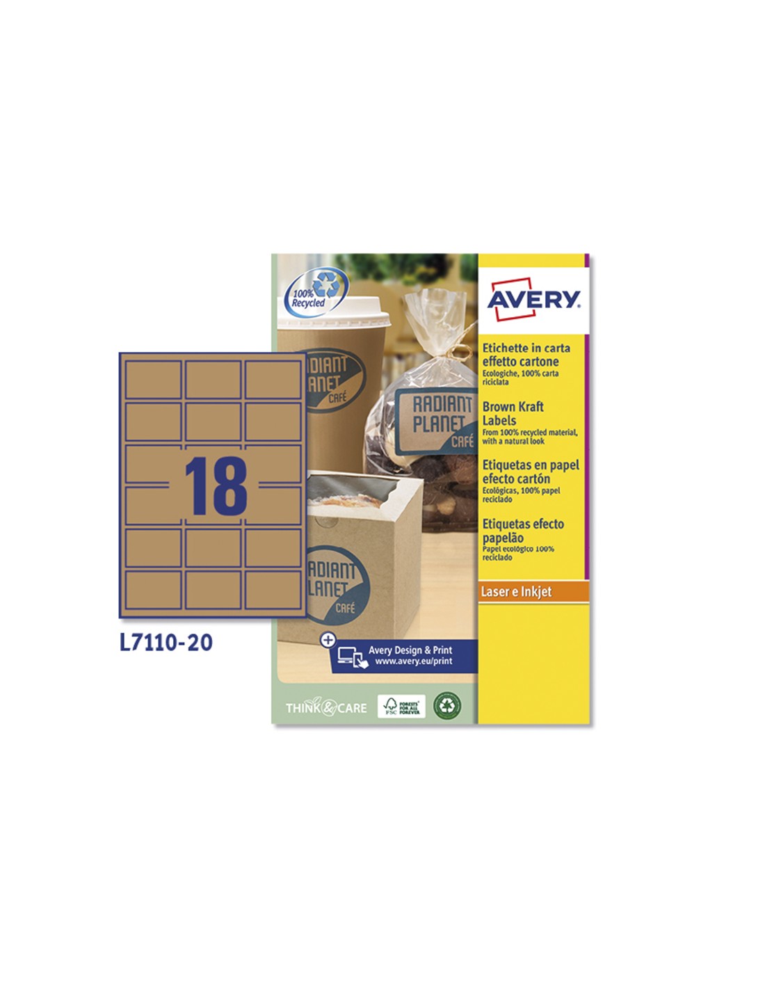 Etiquetas adhesivas de papel kraft recicladas. Adhesivo permanente, perfecta sobre superficies lisas incluso, madera, vidrio, metal y cartón. Compatibles con impresoras ink-jet, láser y fotocopiadoras. Hechas de material proveniente de bosque certificado FSC. Caja de 20 hojas. Se puede utilizar el software crea e imprime gratuito de Avery para realizar el diseño de las etiquetas con pocos clics.