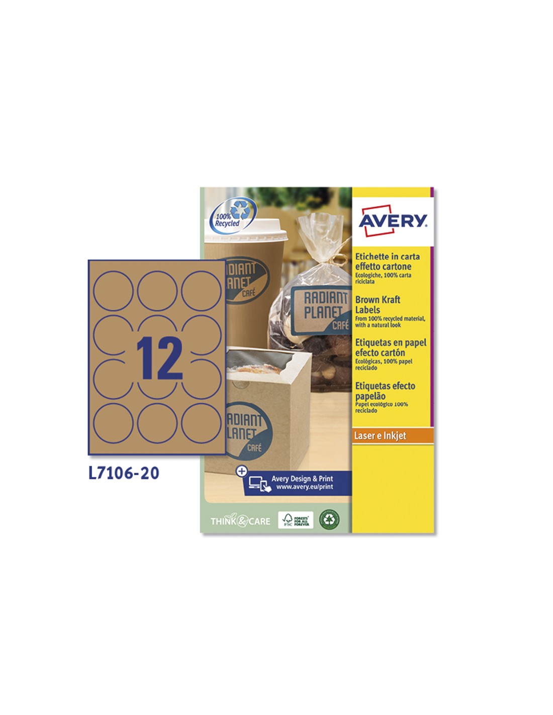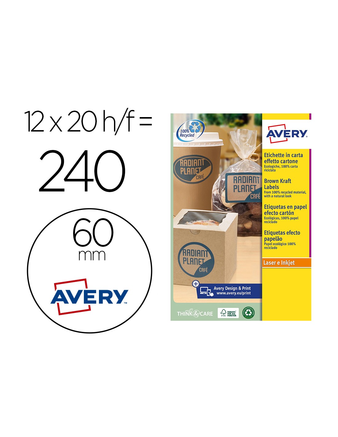 Etiquetas adhesivas de papel kraft recicladas. Adhesivo permanente, perfecta sobre superficies lisas incluso, madera, vidrio, metal y cartón. Compatibles con impresoras ink-jet, láser y fotocopiadoras. Hechas de material proveniente de bosque certificado FSC. Caja de 20 hojas. Se puede utilizar el software crea e imprime gratuito de Avery para realizar el diseño de las etiquetas con pocos clics.
