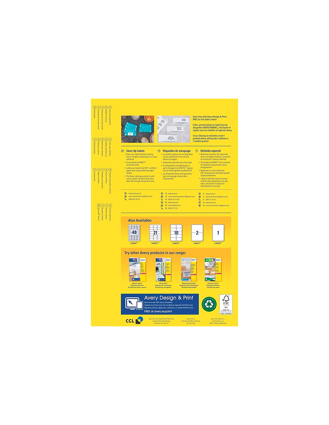 Etiquetas blancas de papel con adhesivo permanente y cubriente. Ideales para reutilizar cajas. Gracias al especial material cubriente permite ocultar la etiqueta anterior. Compatibles con impresoras ink-jet, láser y fotocopiadoras. Hechas de material proveniente de bosque certificado FSC. Caja de 25 hojas.