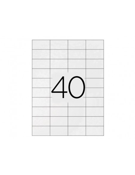 Etiquetas blancas autoadhesivas adecuadas para impresoras ink-jet, láser y fotocopiadoras. Cada caja, según tamaño, incluye 25 o 100 hojas DIN A4 en las que se presentan las etiquetas.
