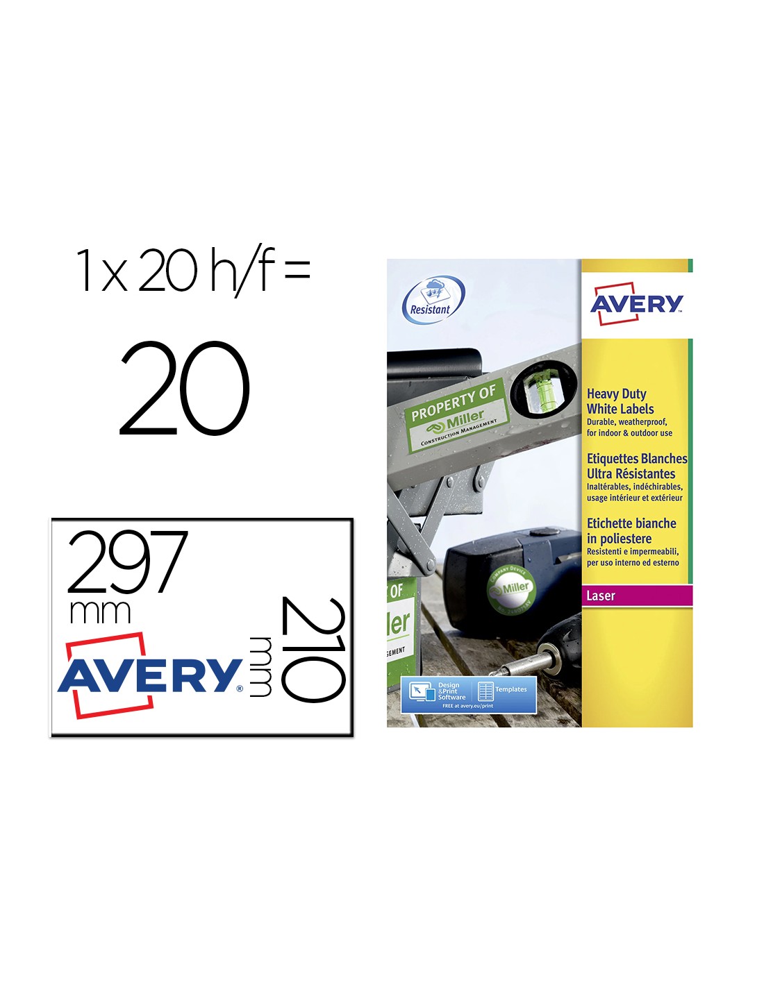 Etiqueta adhesiva resistente avery poliester blanca 210x297 mm laser pack de 20 unidades