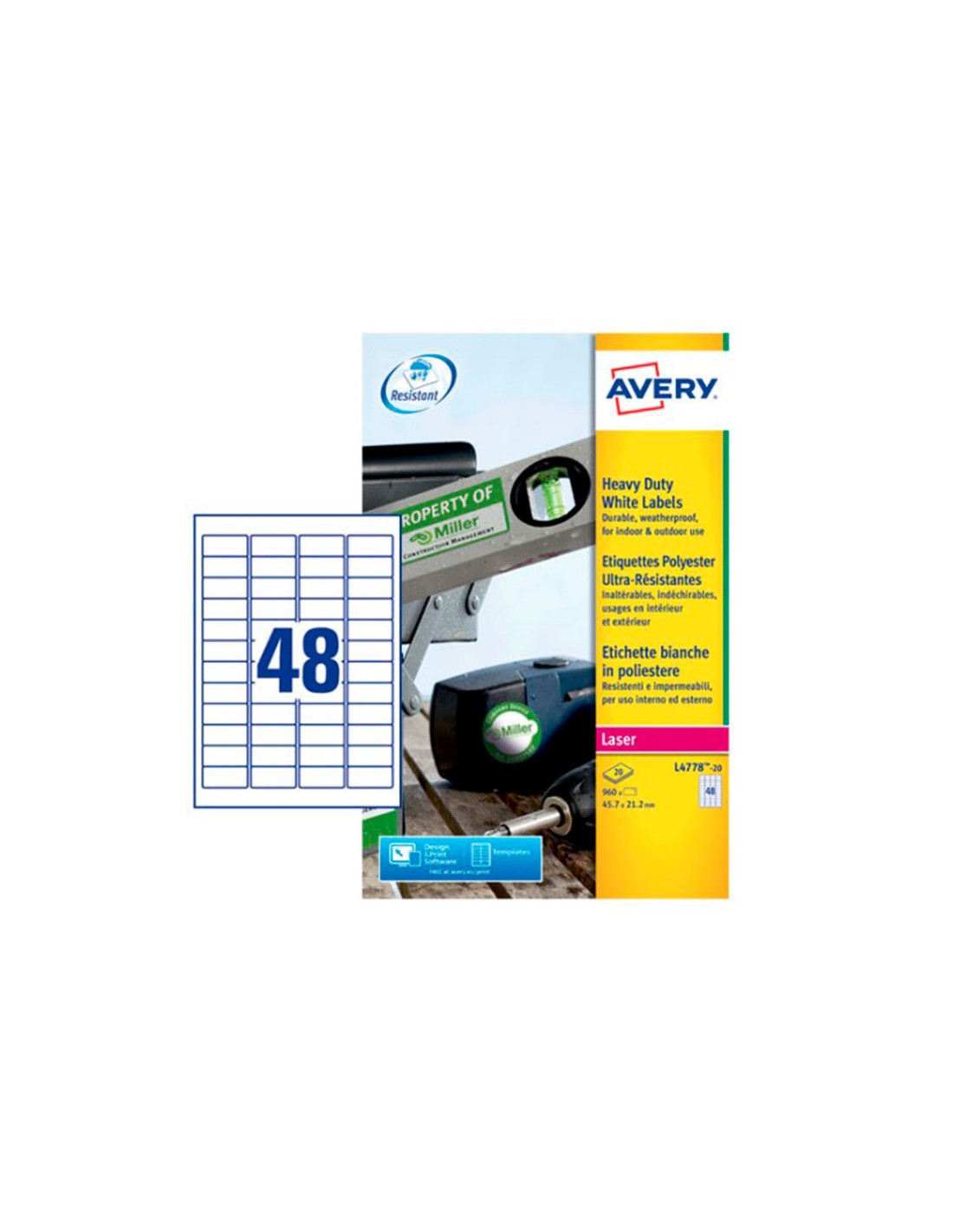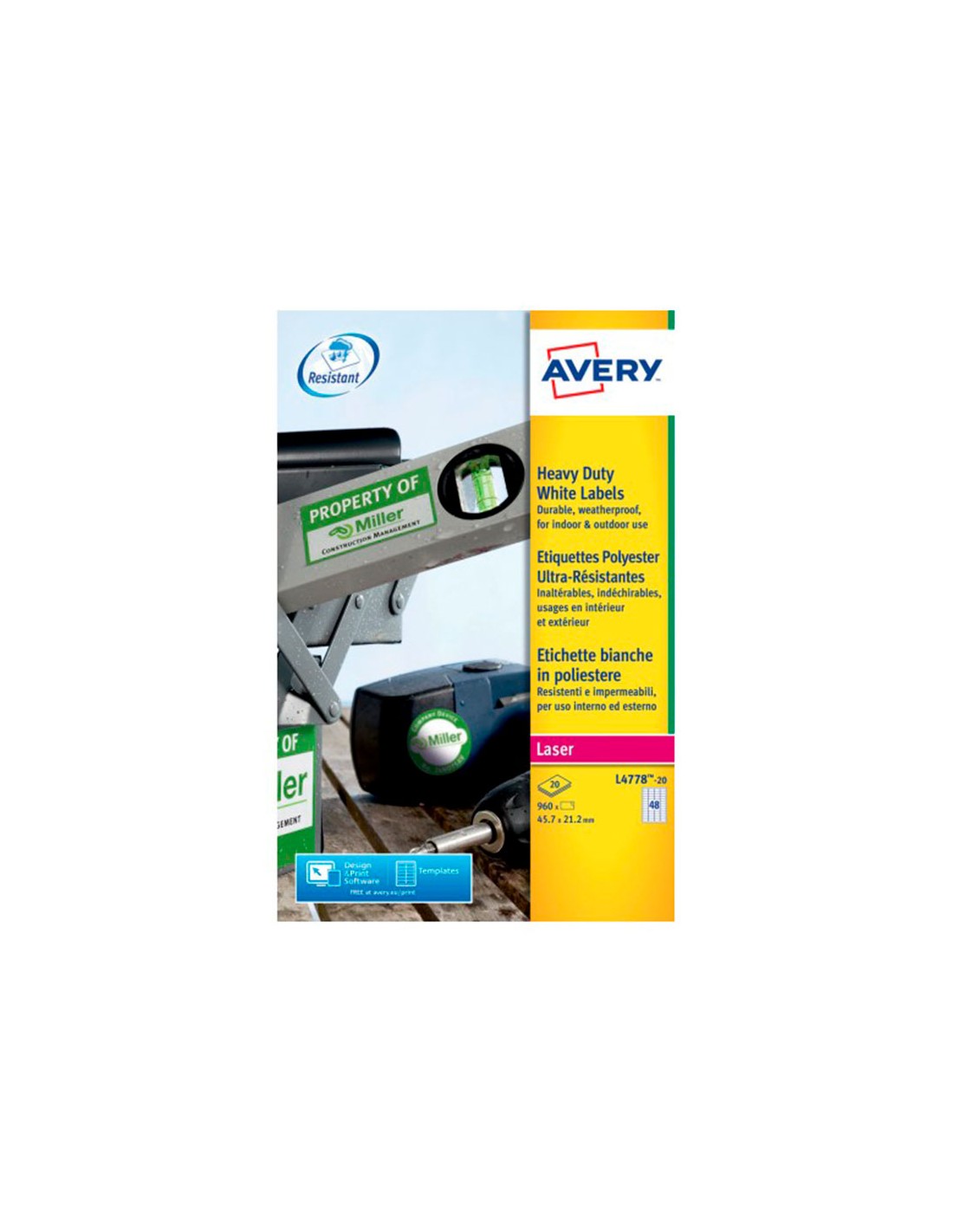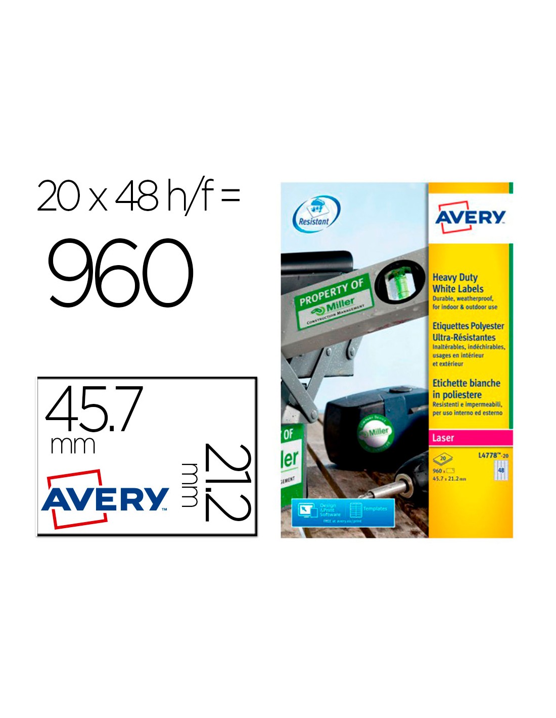 Etiquetas adhesivas de poliéster blanco Avery. Extra resistentes, ideales también para el uso al exterior, en los almacenes y departamentos de producción. Resisten a la suciedad, al agua, a los detergentes, a los rayos UV y a temperaturas extremas desde -20°C hasta +80°C. No se desgarran y se pueden aplicar sobre metal, vidrio, plástico y madera. Impermeables y a prueba de rotura. Adhesivo permanente. Ideales cuando necesitas de una etiqueta más resistente que la de papel. Para impresoras láser. Utiliza el software Crea e Imprime gratuito de Avery para realizar el diseño de las etiquetas con pocos clics. Medidas 45,7x21,2 mm. Caja de 20 hojas A4. 960 Etiquetas por caja.