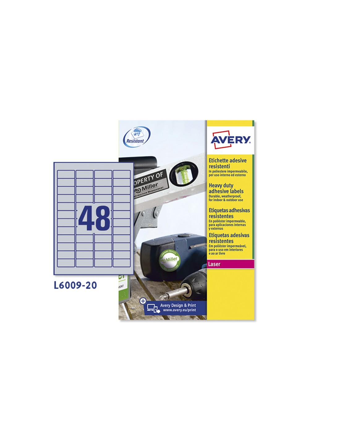 Etiquetas de poliéster plata resistentes a la suciedad, al aceite y al agua. Impermeables y a prueba de rotura. Resistentes a los rayos uv e inalterables a los cambios de temperatura entre -40 y + 150°c. Ideales para uso externo, no se desgarran y se pueden aplicar en metal, vidrio, plástico y madera. Para impresora láser. Adhesivo permanente. Se puede utilizar el software crea e imprime gratuito de Avery para realizar el diseño de las etiquetas con pocos clics. Caja de 20 hojas.
