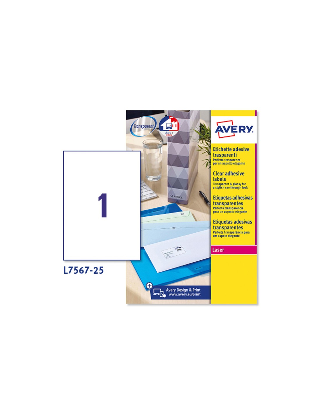 Etiquetas adhesivas de poliéster brillantes transparentes. Perfectas para ser aplicadas sobre vidrio, superficies pulidas, plástico y metal. Resisten al aceite, a la suciedad y a los desgarres, garantizadas para durar por largo tiempo.Compatible con impresora Láser y HP índigo. Se puede utilizar el software crea e imprime gratuito de Avery para realizar el diseño de las etiquetas con pocos clics. Caja de 25 hojas.