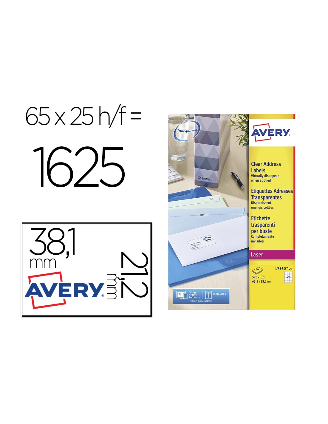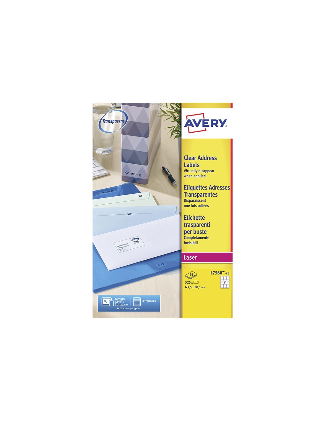 Etiquetas adhesivas de poliéster brillantes transparentes. Perfectas para ser aplicadas sobre vidrio, superficies pulidas, plástico y metal. Resisten al aceite, a la suciedad y a los desgarres, garantizadas para durar por largo tiempo. Compatible con impresora Láser y HP índigo. Se puede utilizar el software crea e imprime gratuito de Avery para realizar el diseño de las etiquetas con pocos clics. Caja de 25 hojas.