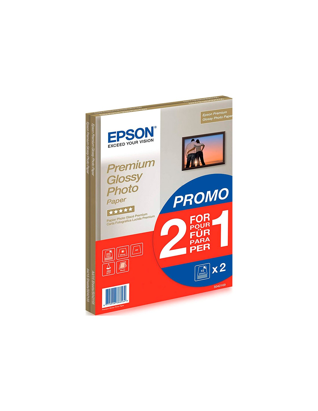 Papel fotográfico Epson. Glossy. Din A4. 255 g/m². Consigue fotos resistentes a las manchas y al agua con colores vivos, tonos espléndidos y unos detalles increíbles combinando los papeles y las tintas de Epson. Este papelse ha desarrollado específicamente para que funcione con la gama de tinta s e impresoras de Epson, a fin de ofrecer la mejor calidad posible. Así, todo será tal y como lo recuerdas, con colores naturales, gradaciones fluidas, tonos de piel realistas y mucho más. Indicado para catálogos, calendarios, fotografías, tarjetas, etc. Pack promocional 2x1 paquetes de 15 hojas.