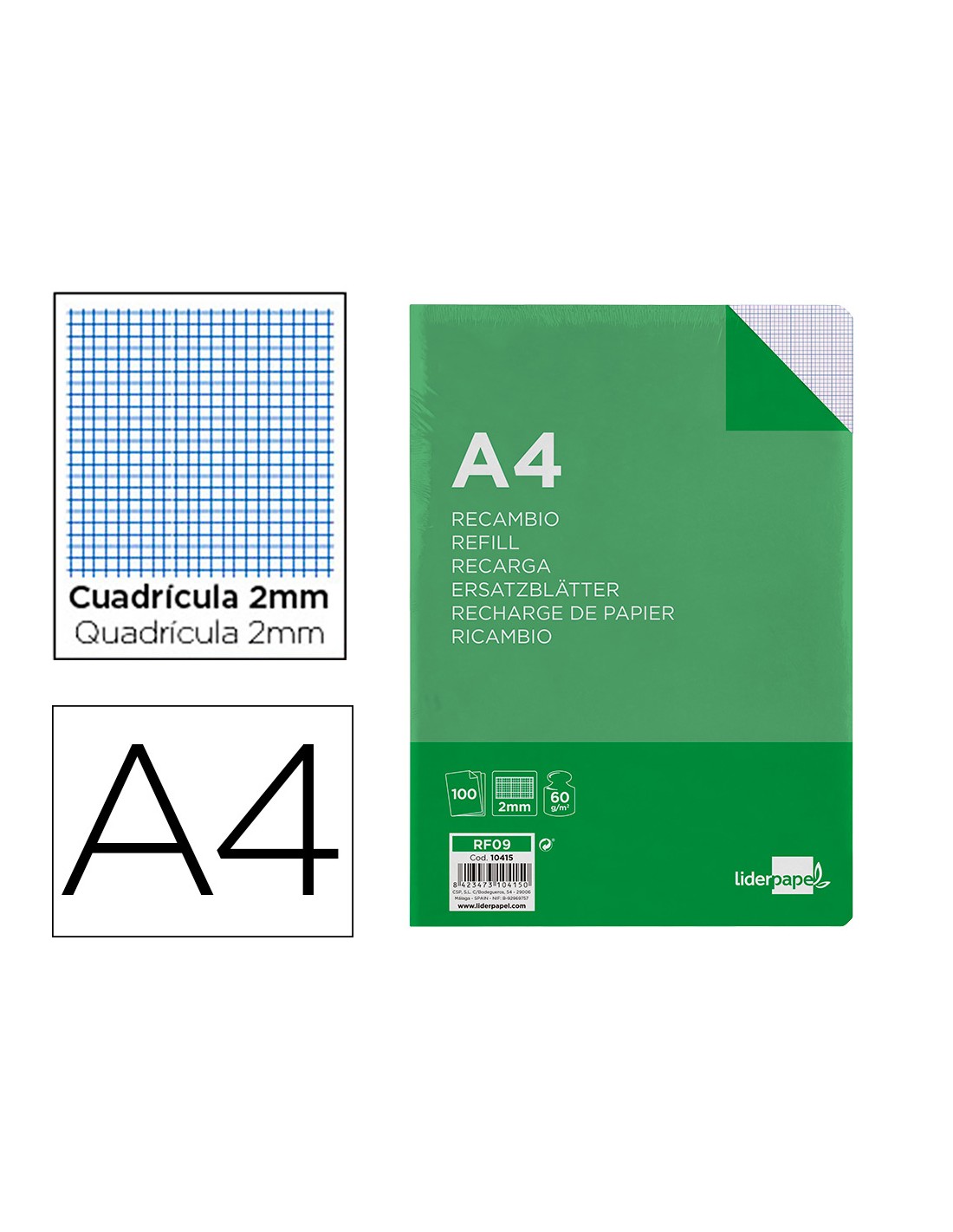 Recambio liderpapel a4 100 hojas 60g/m2 milimetrado sin margen 4 taladros