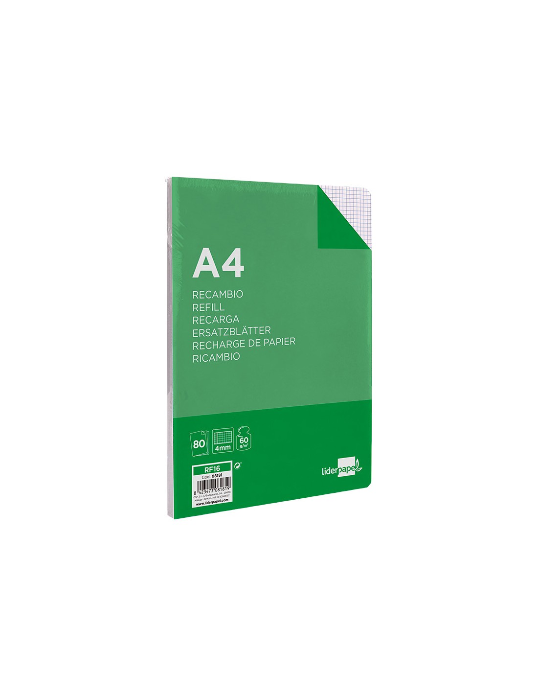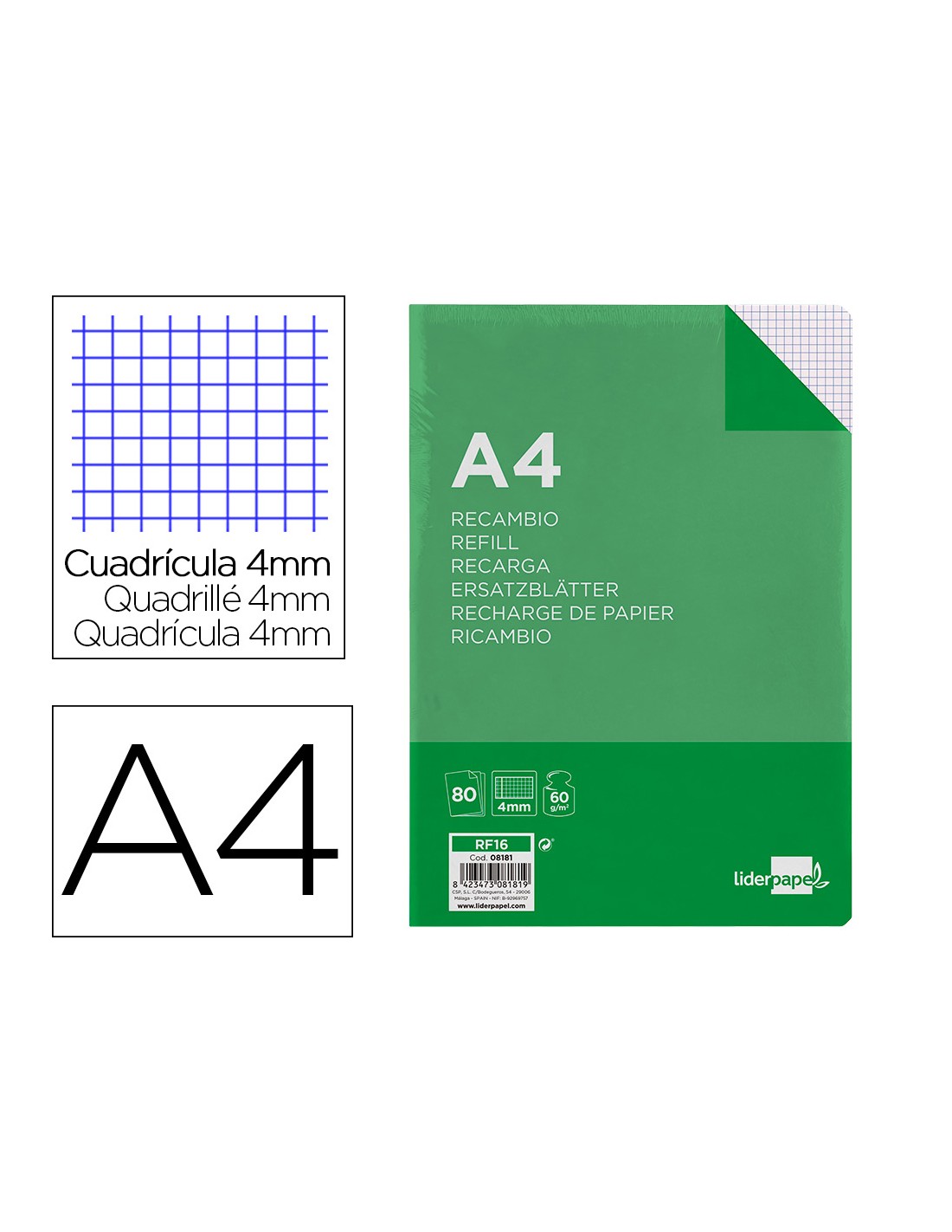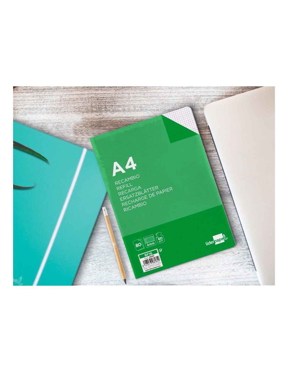Recambio liderpapel a4 80 hoja 60g/m2 cuadro 4 mm con margen 4 taladros