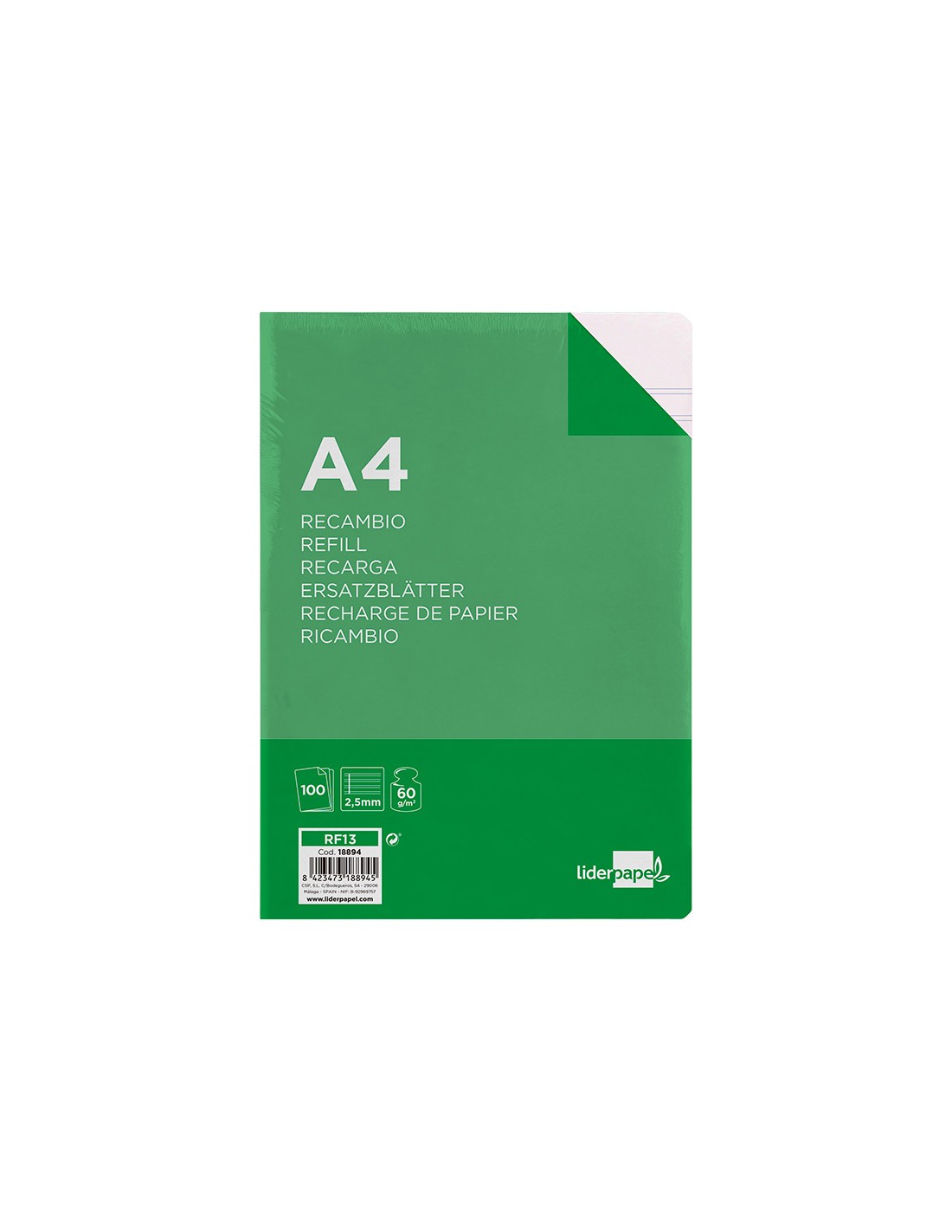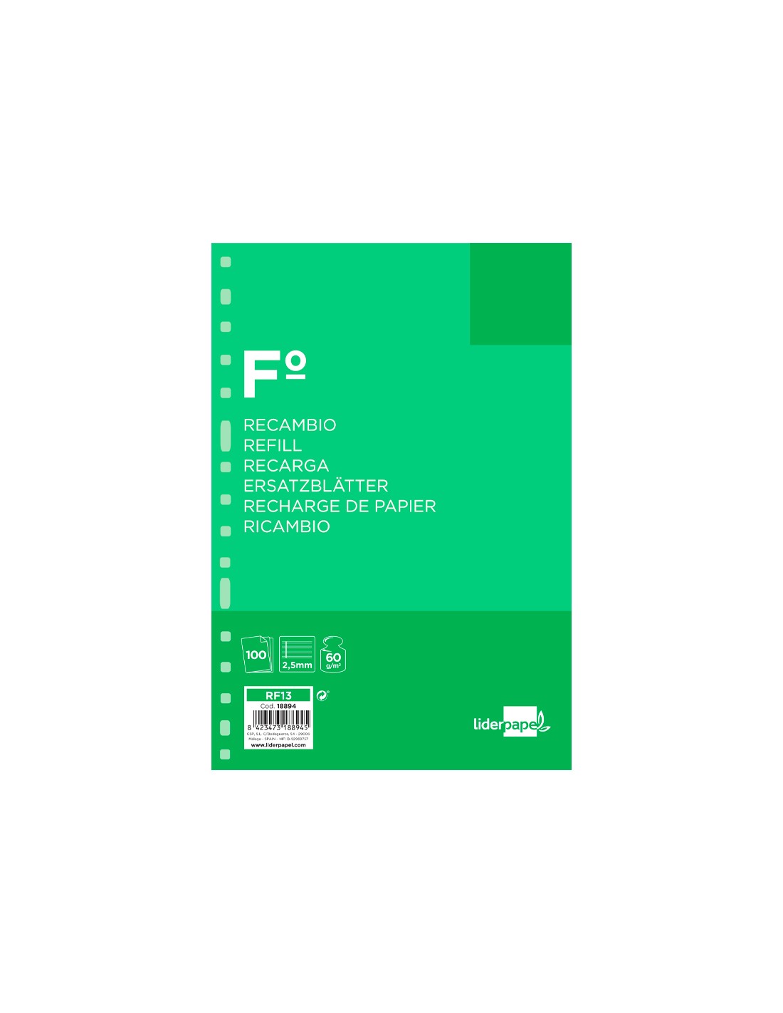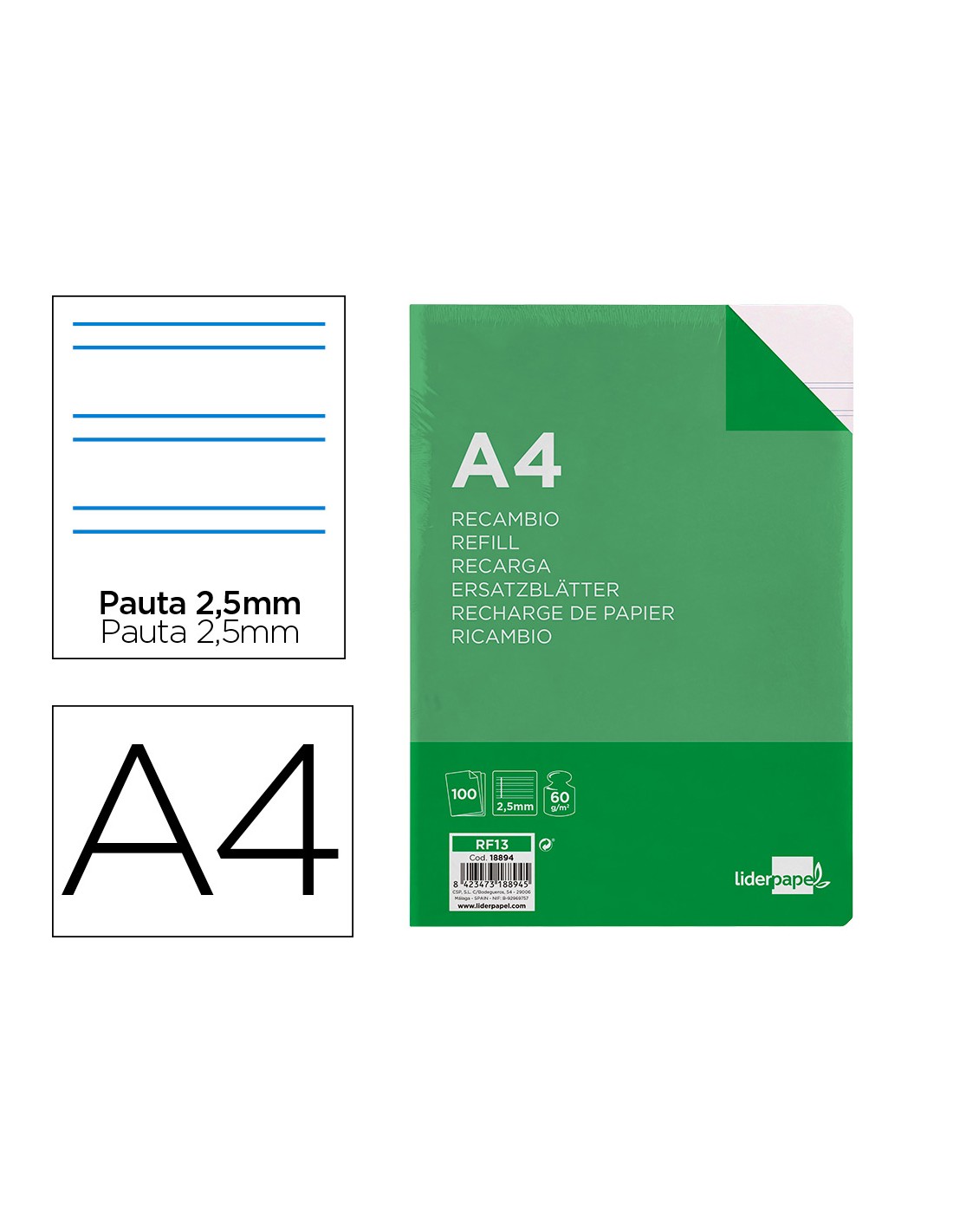 LIDERPAPELRecambio liderpapel folio 100 hojas 60g/m2 pauta 5ª 2.5mm con margen 16 taladros