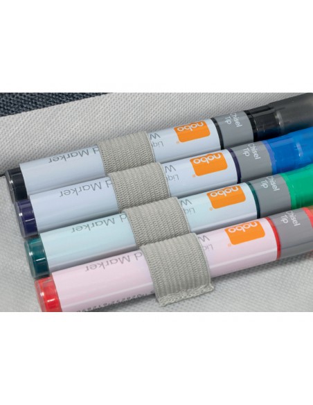 Esta bolsa kit de accesorios portátil para pizarra, ofrece la máxima flexibilidad, lo que permite celebrar reuniones de colaboración y sesiones de lluvia de ideas donde y cuando lo necesites. Con tapa magnética para guardar cómodamente los imanes y gomas elásticas para acceder fácilmente a los rotuladores de pizarra. Esta elegante bolsa de tela es ligera y contiene todo lo esencial, garantizando un trabajo en equipo productivo en la oficinao fuera de ella. Incluye 10 rotuladores multicolores con punta de cincel para pizarra, 10 imanes surtidos de 38 mm para pizarra, cuadrados magnéti