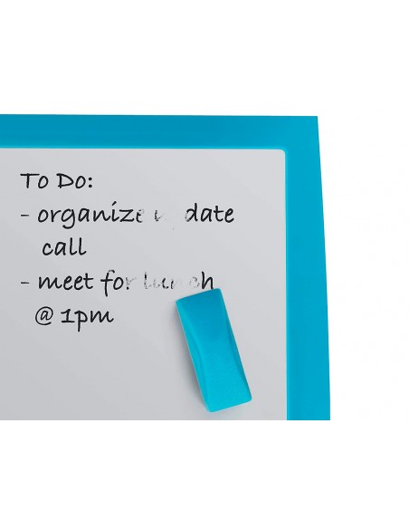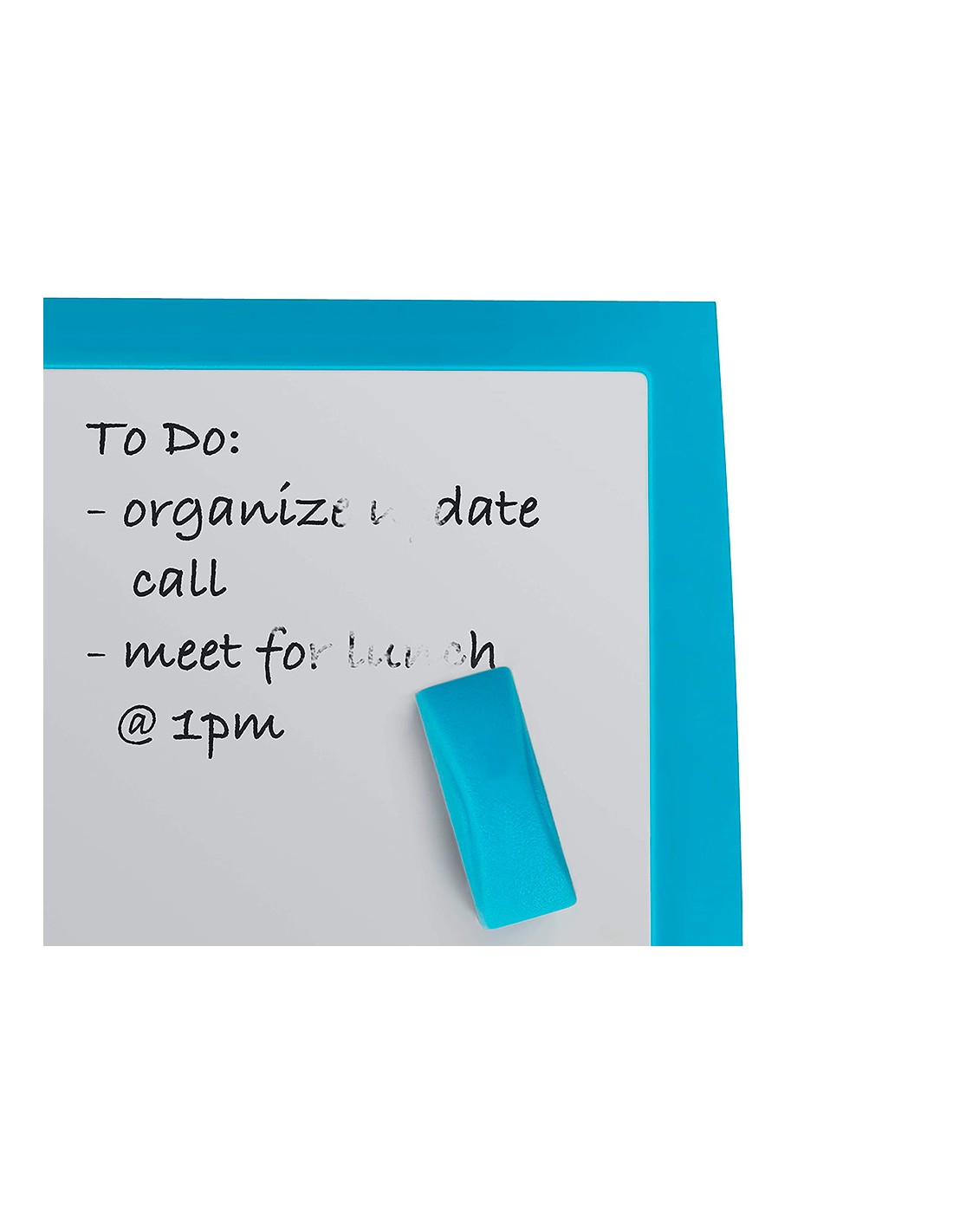 Pizarra magnética pequeña con marco de colores vibrantes. Con un minirrotulador magnético para pizarra, imanes de pizarra estampados, borrador de pizarra blanca a juego y un kit de fijación para montaje en la pared. Medidas 58 x 43 cm.