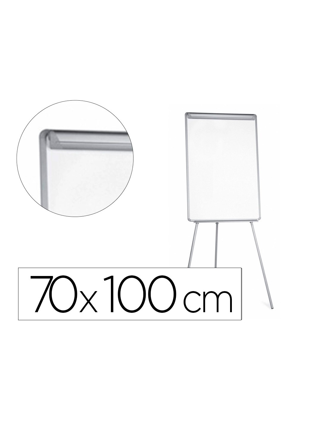 Pizarra trípode con marco y bandeja en plástico gris. Superficie disponible en acabado laminado no magnético o lacado magnético, ambos aptos para escritura con rotuladores de borrado en seco. También aptas para todo tipo de blocs de papel gracias a su pinza superior. Pies telescópicos con altura regulable hasta 195 cm. Con bandeja inferior para rotuladores y accesorios. Medidas del tablero 70 x 100 cm.
