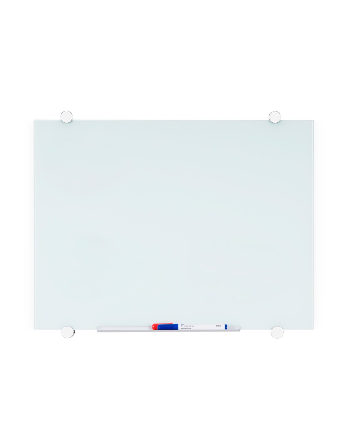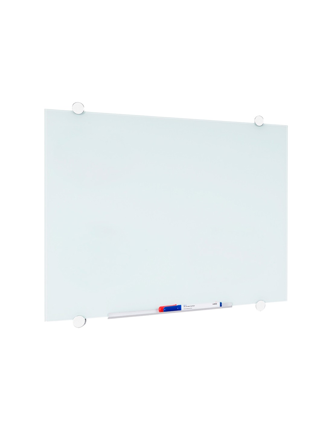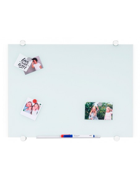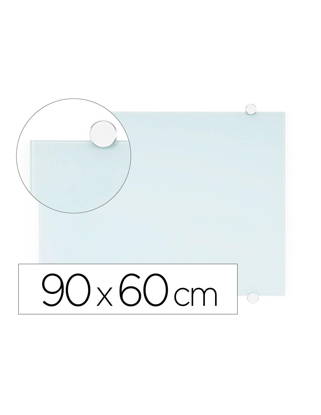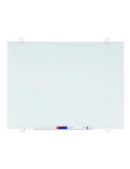 Pizarra de cristal templado de 4 mm. Superficie de alta calidad que permite una escritura fácil y suave. Magnética. Color blanco. Bandeja, rotulador negro, borrador y 2 imanes incluidos. Provista de accesorios de fijación a la pared. Medidas 90 x 60 cm.