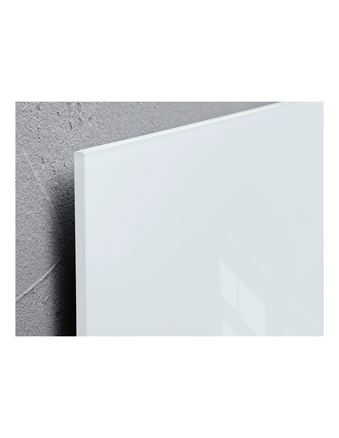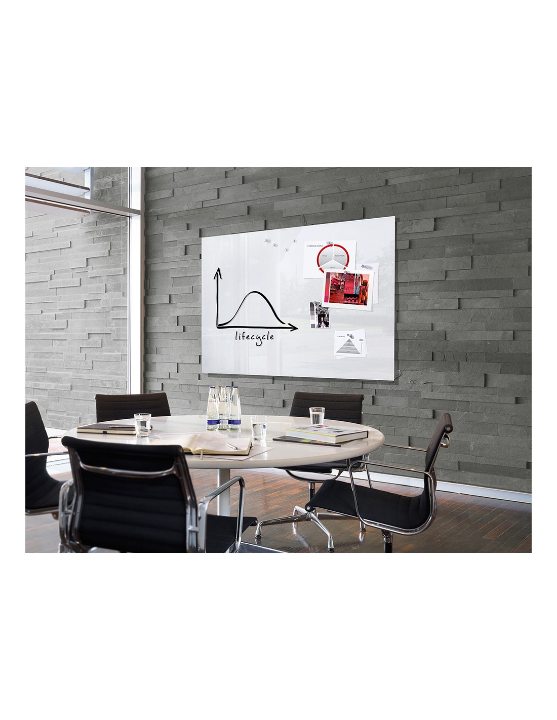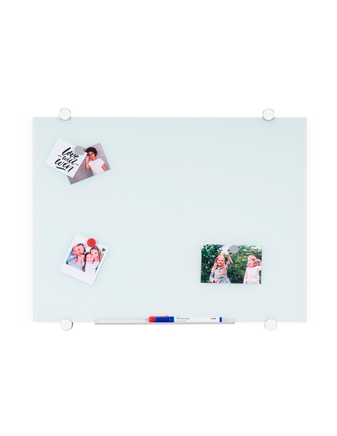 Pizarra de cristal templado de 4 mm. Superficie de alta calidad que permite una escritura fácil y suave. Magnética. Color blanco. Bandeja, rotulador negro, borrador y 2 imanes incluidos. Provista de accesorios de fijación a la pared. Medidas 90 x 60 cm.