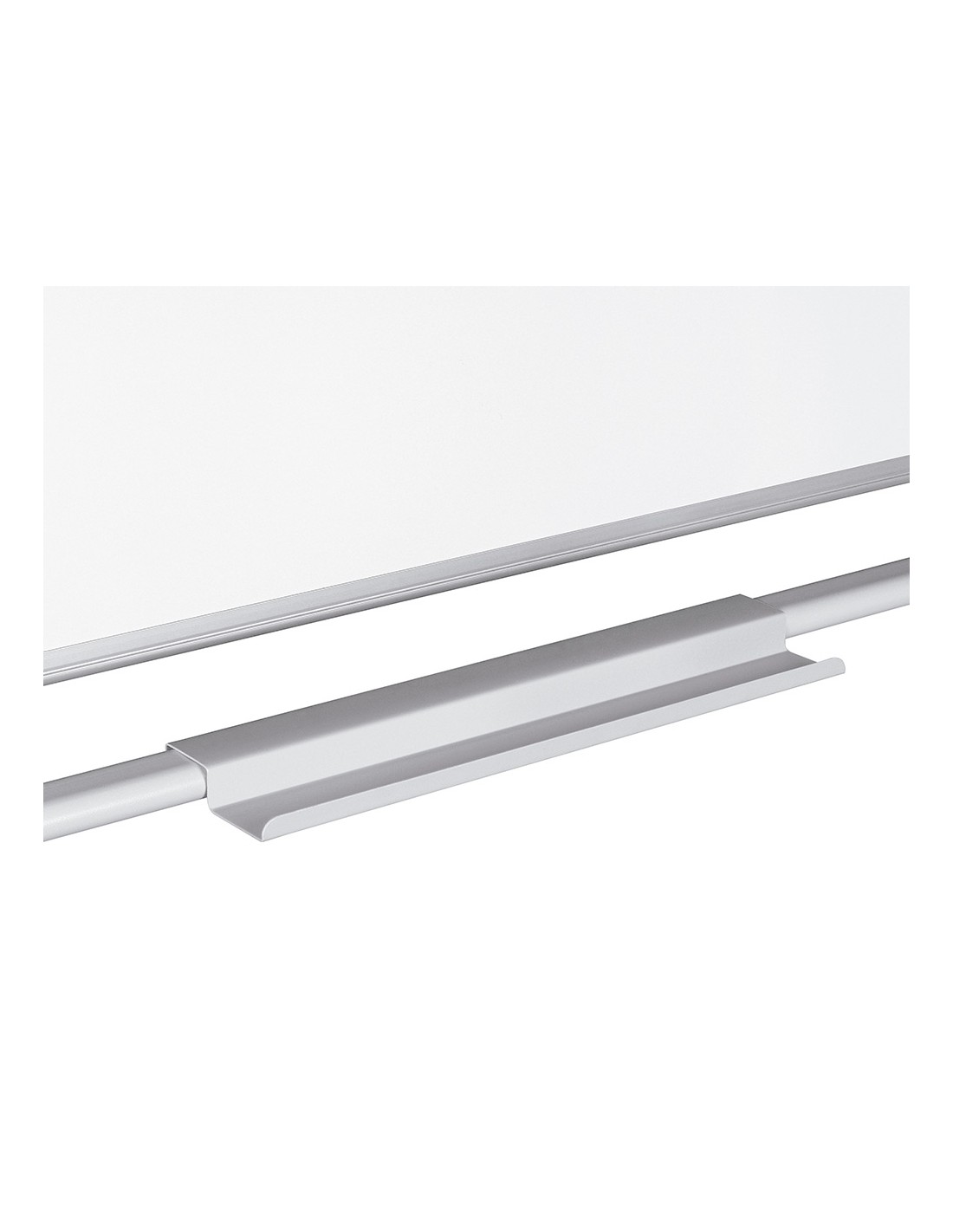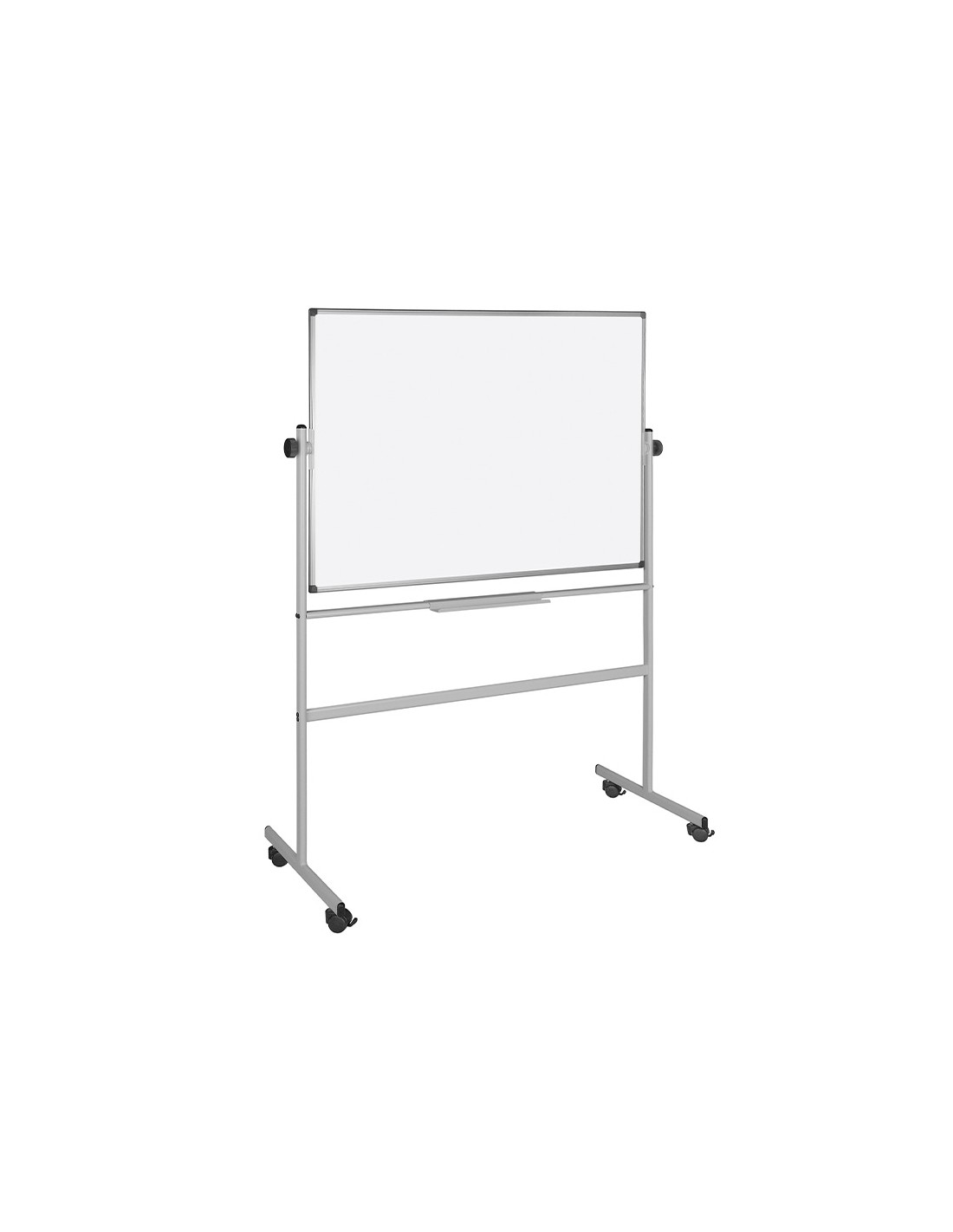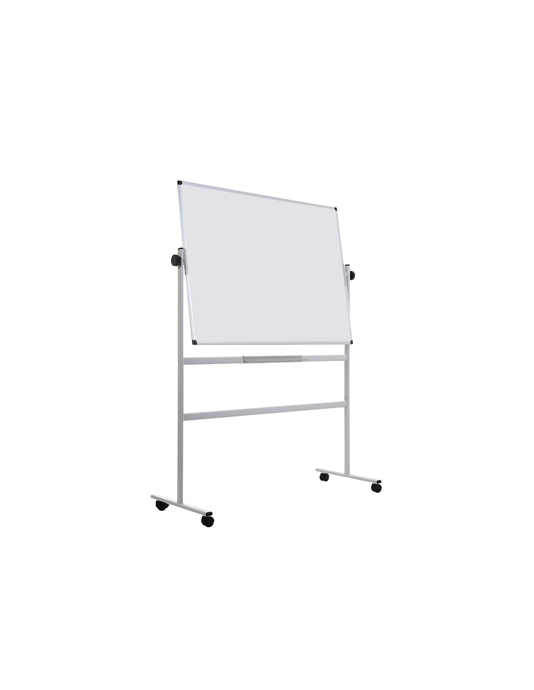 Pizarra de melamina con doble cara pivotante alrededor de un eje con ajuste para su bloqueo. Enmarcadas en aluminio anodizado y cantoneras decorativas de plástico. Estructura metálica lacada en color gris, con ruedas y frenos en las cuatro ruedas. Va provista en toda su longitud de una amplia bandeja desmontable para accesorios. Medidas del tablero 120 x 90 cm. Medidas de la pizarra completa 55 x 127 x 180 cm.