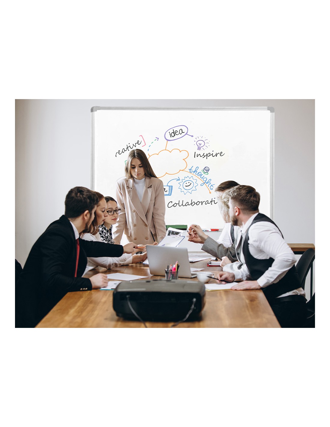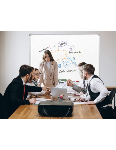 Superficie lisa. Con marco de aluminio. Utilizar sólo rotuladores especiales para pizarra blanca. Bandeja incluida. Adaptable a formato vertical. Provista de accesorios de fijación a la pared.