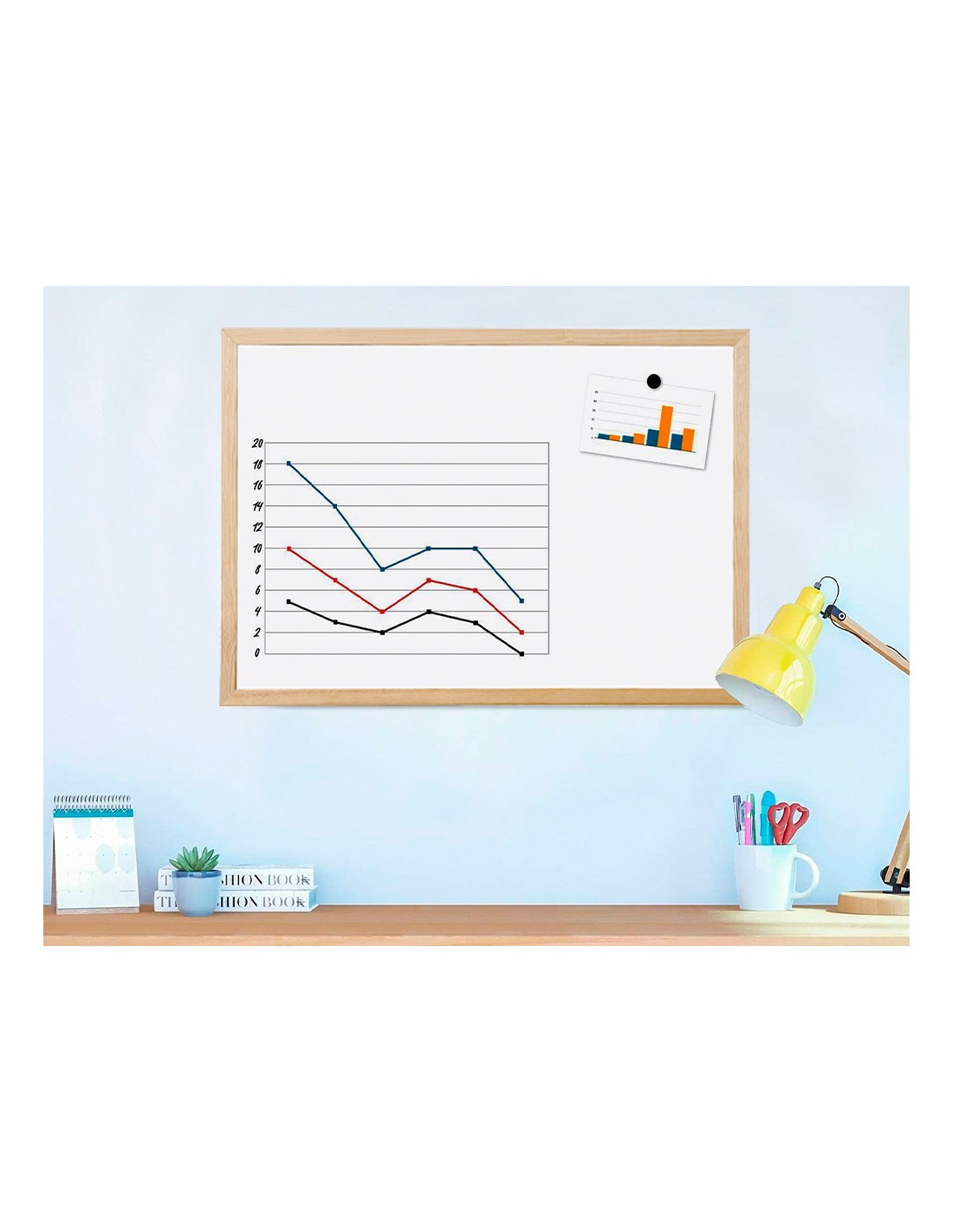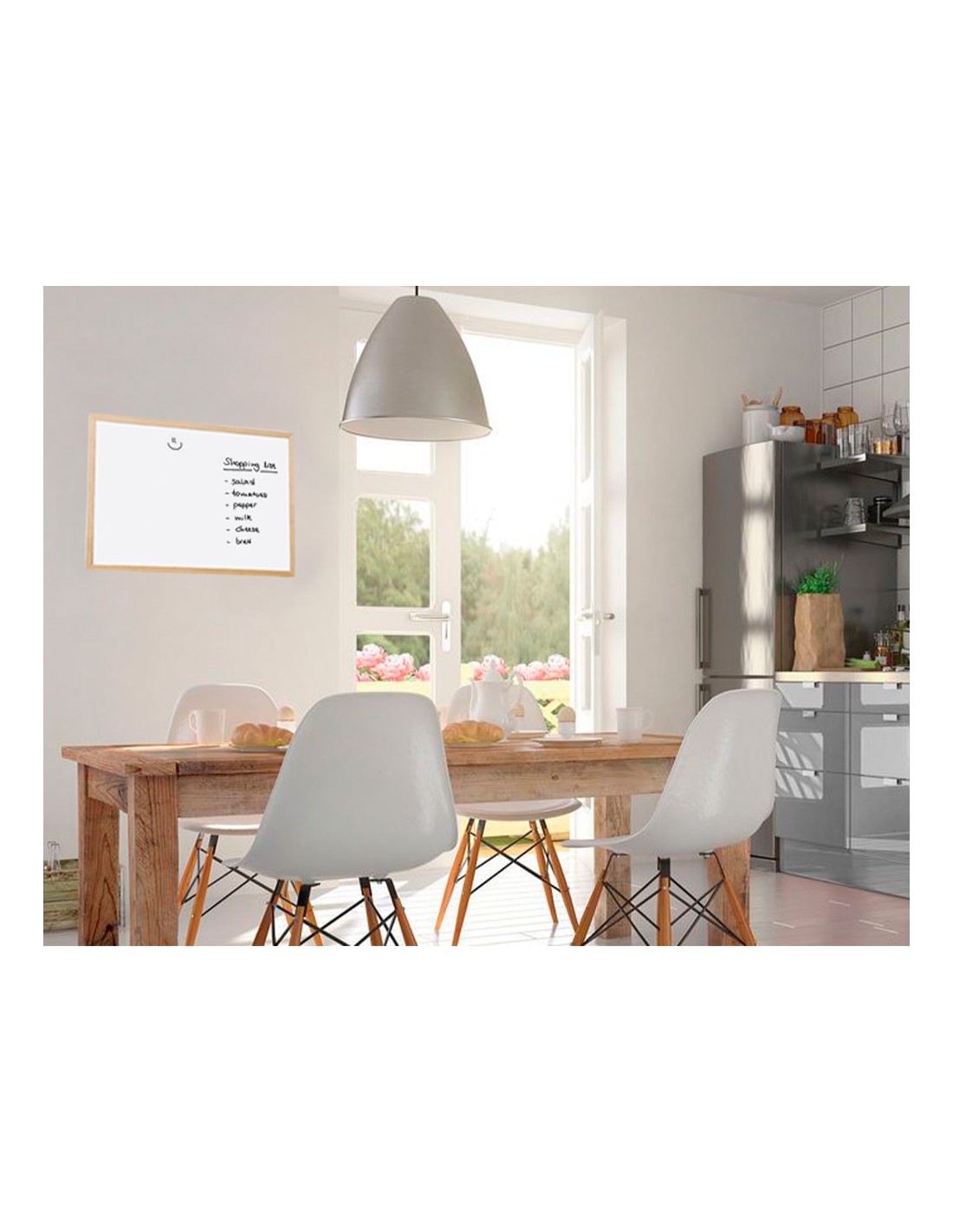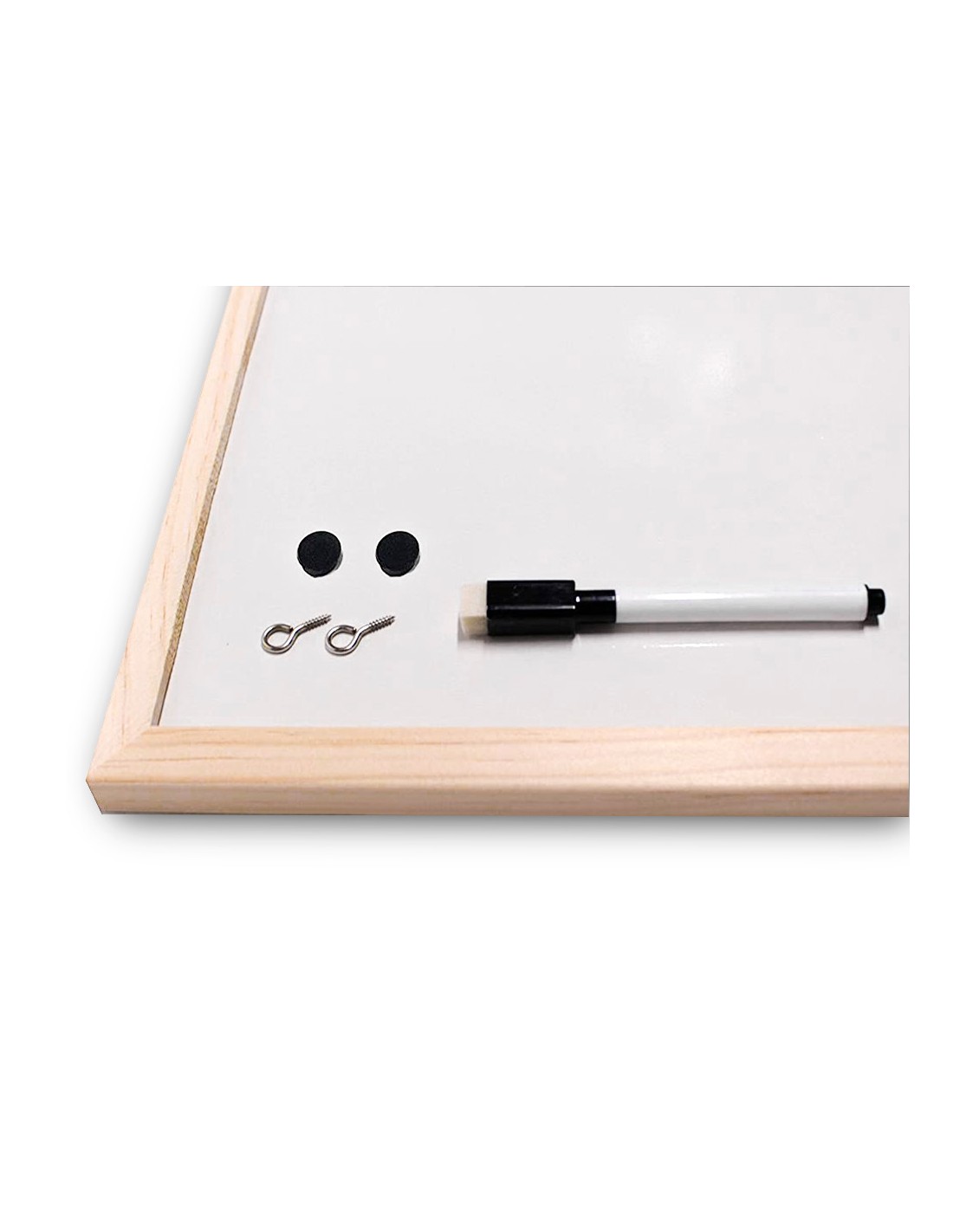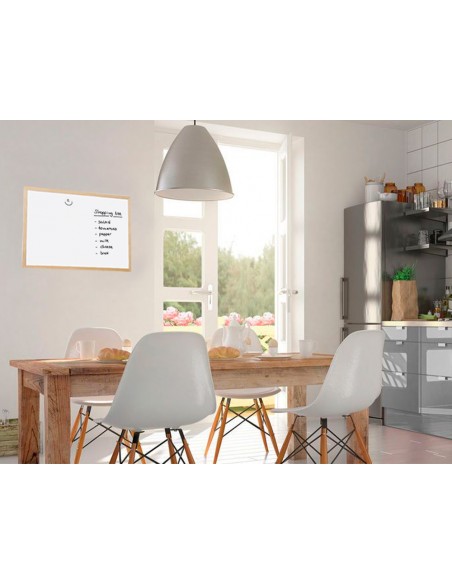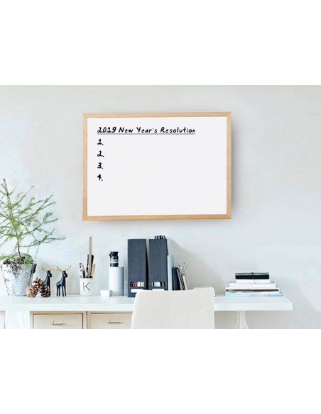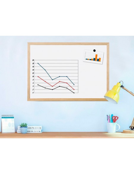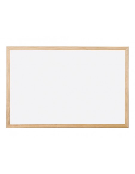 Pizarra de melamina, con una superficie lisa que permite una escritura suave y uniforme. Superficie lavable. Gran estabilidad. Utilizar solo rotuladores especiales para pizarra blanca. Con marco de madera de pino natural. Provista de accesorios de fijación a la pared.