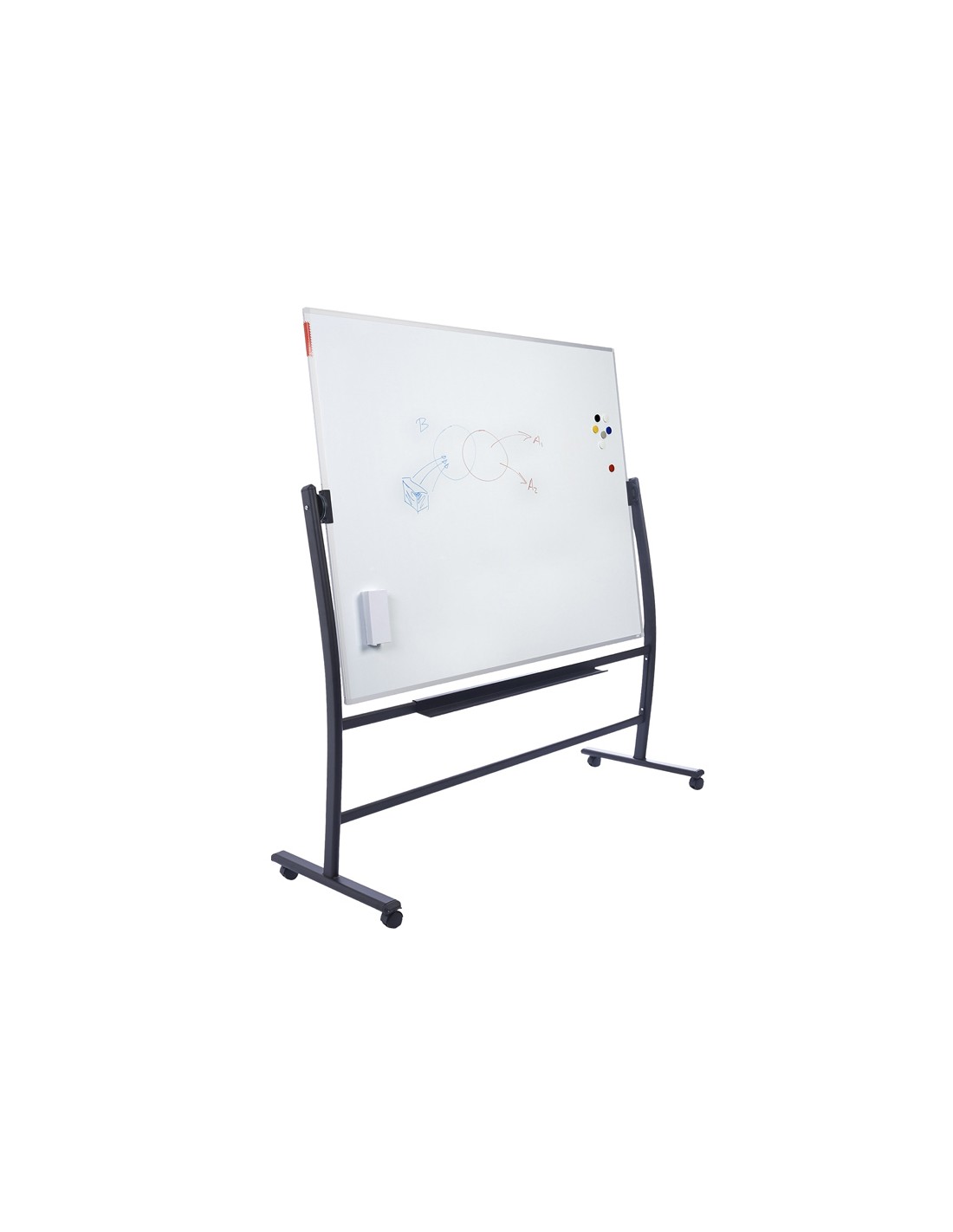Pizarra magnética con superficie de acero lacado y marco de aluminio anodizado apta para escribir con rotuladores especiales para pizarra blanca. Estructura volteable con forma ergonómica curvada de gran diseño. Sistema patentado de rotación que permite la activación y bloqueo desde un solo extremo, aportando mayor seguridad en el giro y mayor estabilidad en la escritura. Estructura con ruedas para su desplazamiento. Incluye bandeja para rotuladores. Medidas 120 x 90 cm.