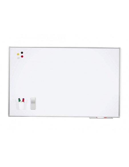 Pizarra lacada con marco de aluminio anodizado y cantoneras embellecedorasde PVC. Superficie apta para la escritura con rotuladores de borrado en s eco e imanes. Incluye una bandeja para rotuladores y sus accesorios para la instalación en la pared. Recomendada para un uso frecuente.