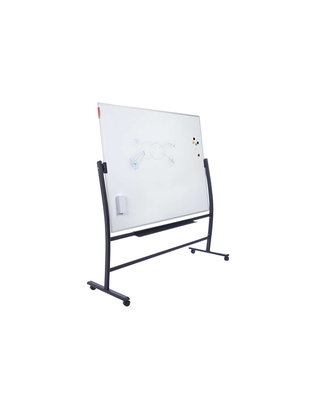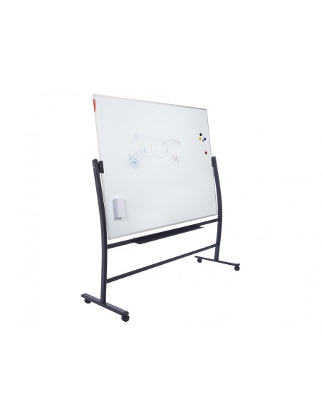 Pizarra magnética con superficie de acero vitrificado de alta calidad y marco de aluminio anodizado apta para escribir con rotuladores especiales para pizarra. Estructura volteable con forma ergonómica curvada de gran diseño. Sistema patentado de rotación que permite la activación y bloqueo desde un solo extremo, aportando mayor seguridad en el giro y mayor estabilidad en la escritura. Estructura con ruedas para su desplazamiento. Incluye bandeja para rotuladores. Medidas 120 x 90 cm.
