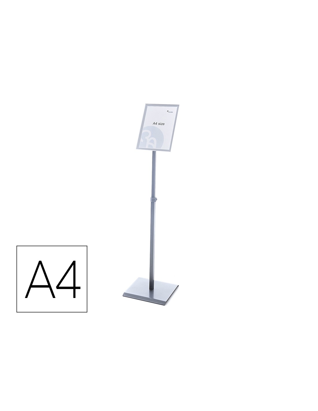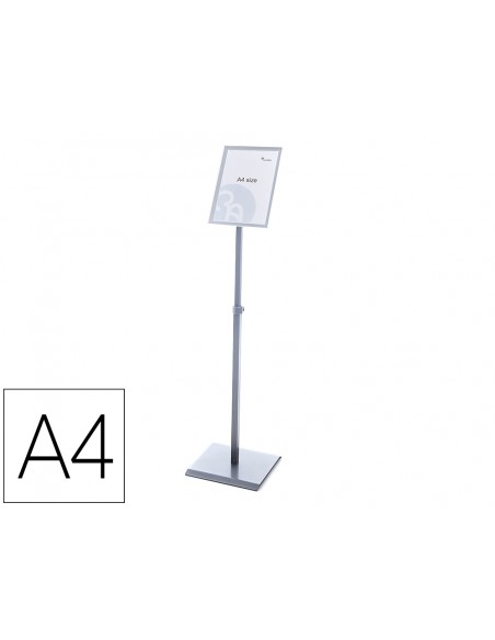 Display soporte informativo y expositor de pie formato A4. Pie regulable en altura y metálico pintado en epoxy gris mate. Superficie de acero lacadoblanco para escritura rotulador de pizarra blanca y giro de 90º para most rar la información en horizontal o vertical.
