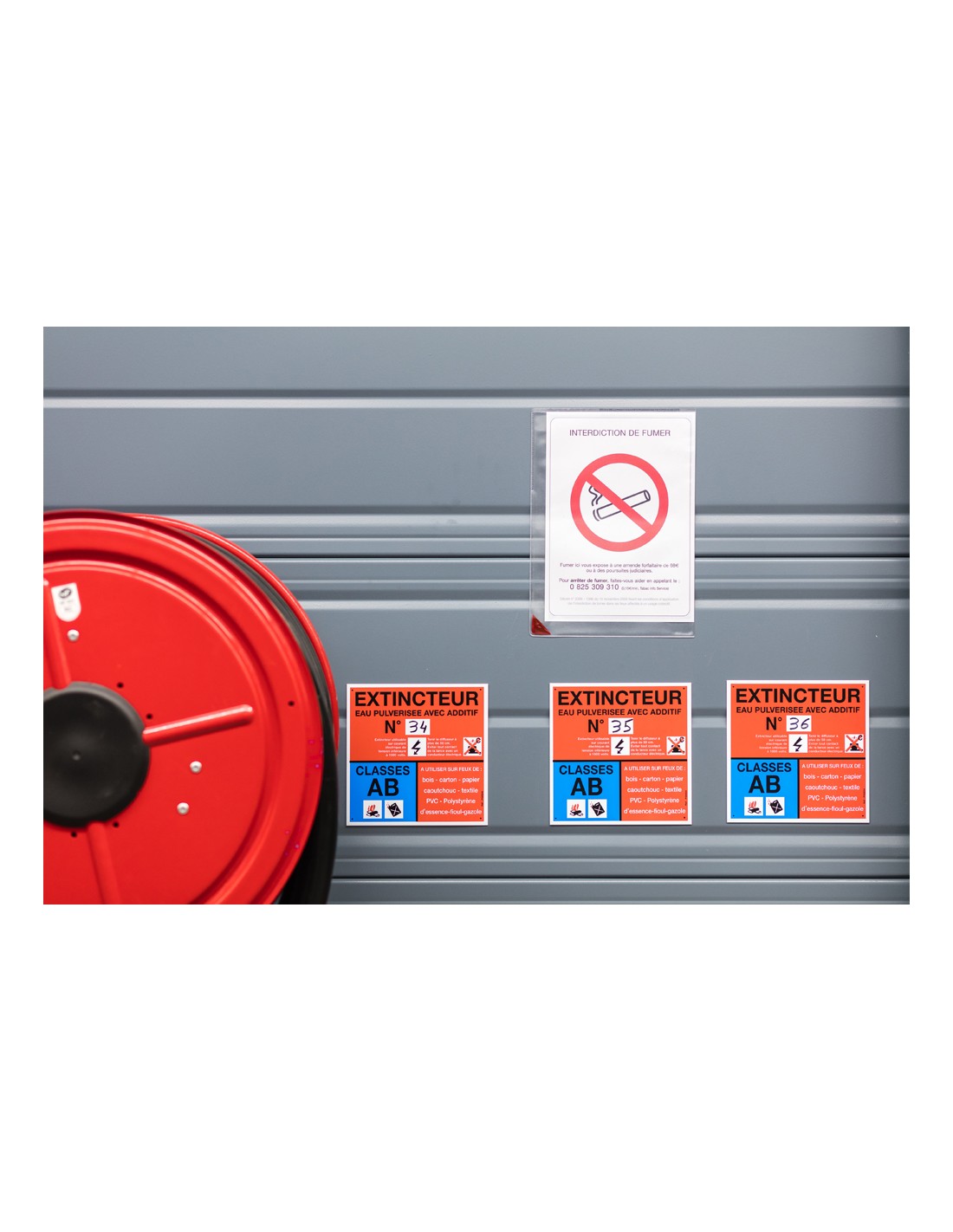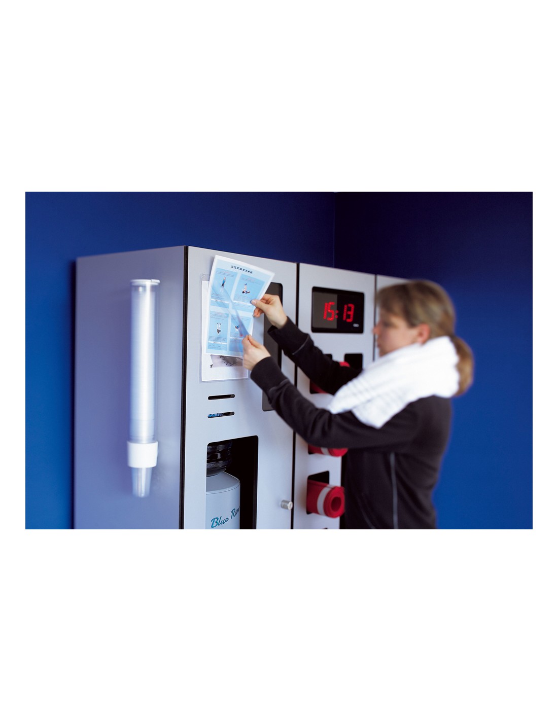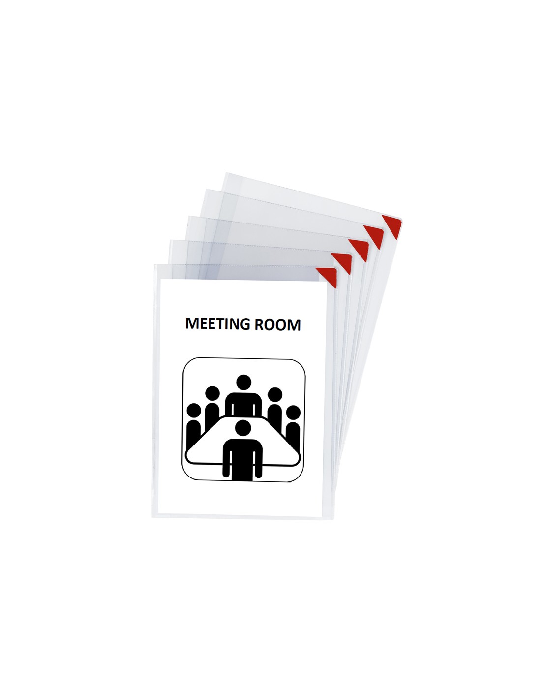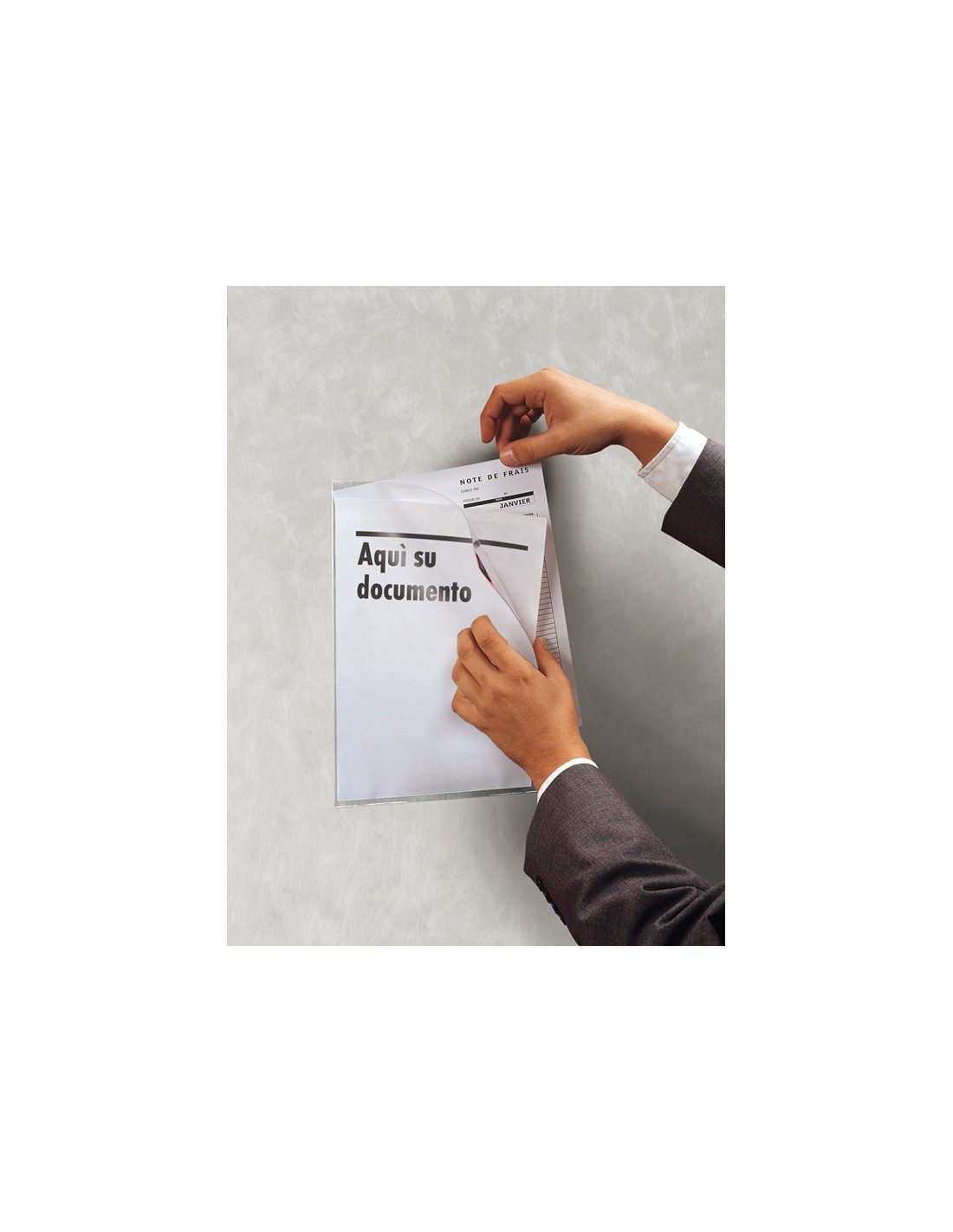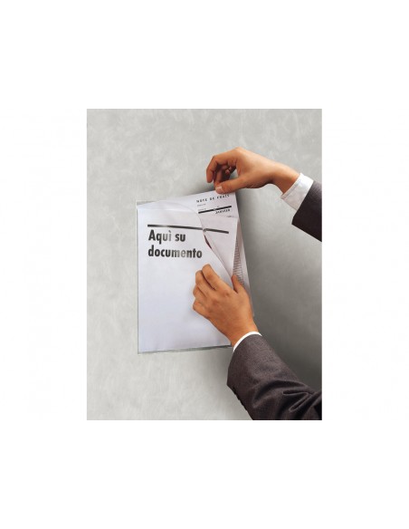 Funda en PVC con adhesivo reposicionable en el dorso y cierre por esquina imantada roja. Capacidad hasta 10 hojas de 80 g/m². Se lee por ambas caras. Ideal para superficies lisas escaparates, puertas, pared, metal, etc. No deja residuos. Vertical / horizontal.