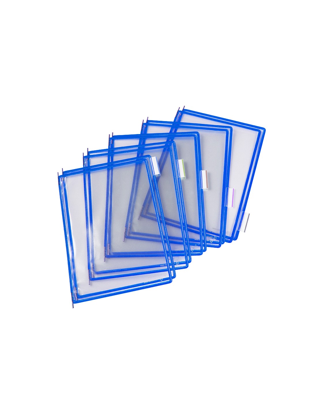 Fundas para documentos DIN A4 fáciles de insertar y extraer de los soportes. Bordes de color. Fabricadas en PVC antirreflejo, con pivotes metálicos para su inserción. Incluye índices indicadores de 50 mm. Apertura superior o lateral. Se fija a todos los soportes metálicos (de pared, de sobremesa, rotores...). El pack de 10 fundas.