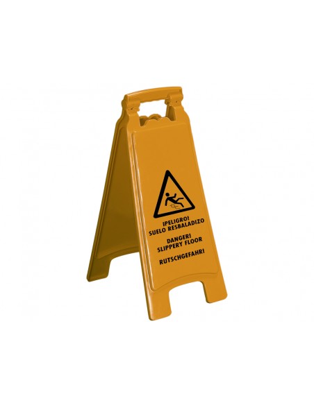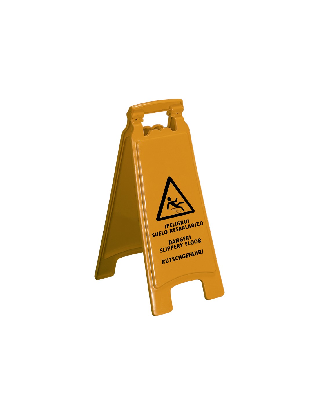 ¡Peligro! Suelo resbaladizo . Homologado según RD 485/1997. Idiomas español, inglés y alemán.