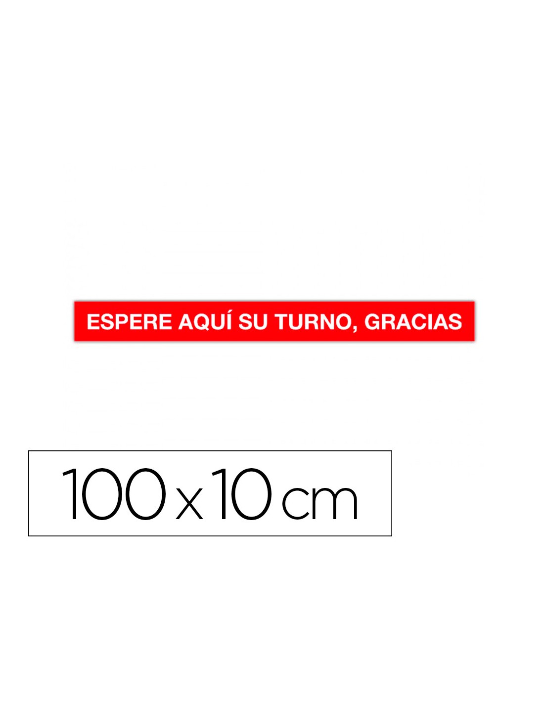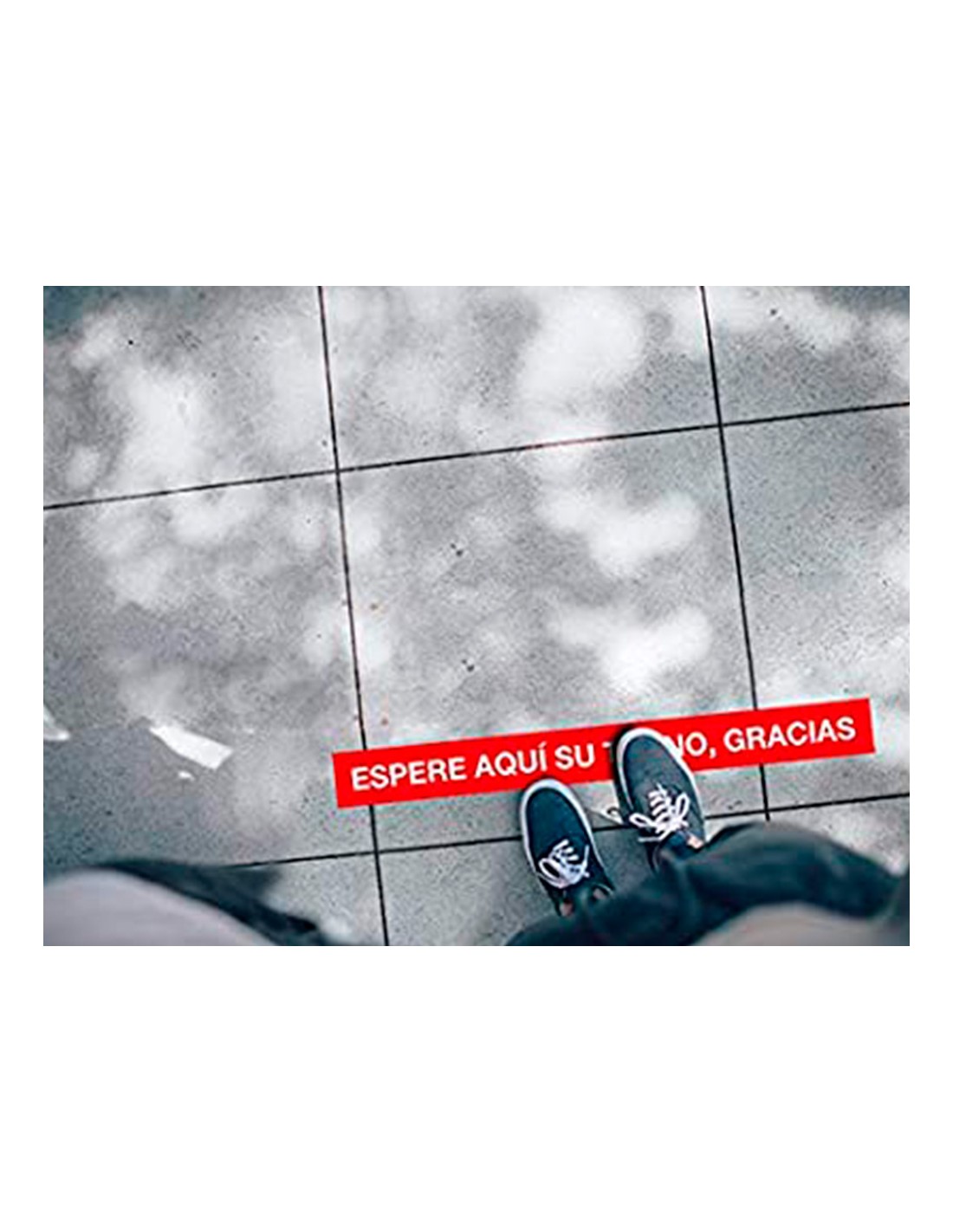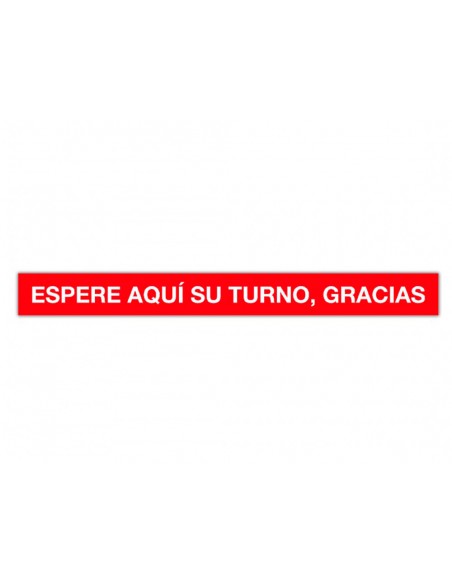 TIRA DE SEÑALIZACIÓN ADHESIVA CON MENSAJE ESPERE AQUÍ SU TURNO. TIRAS DE 100 X 10 CM CON IMPRESIÓN, ACABADO MATE Y ADHESIVO SOLVENTE DE ALTA RESISTENCIA QUE NO DEJA RESIDUOS. EL FILM DE PVC PERMITE DAR GRAN CONSISTENCIA A LA CINTA, APORTA MUCHA RIGIDEZ Y LA HACE MUY RESISTENTE, OFRECE 100 MICRAS PARA GARANTIZAR UN PRODUCTO DE ALTA DURABILIDAD Y UNA CAPA DE BARNIZ MATE PROTECTORA DE 80 MICRAS