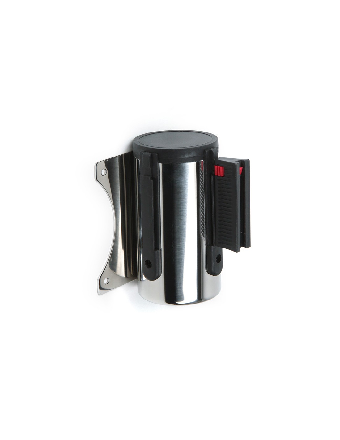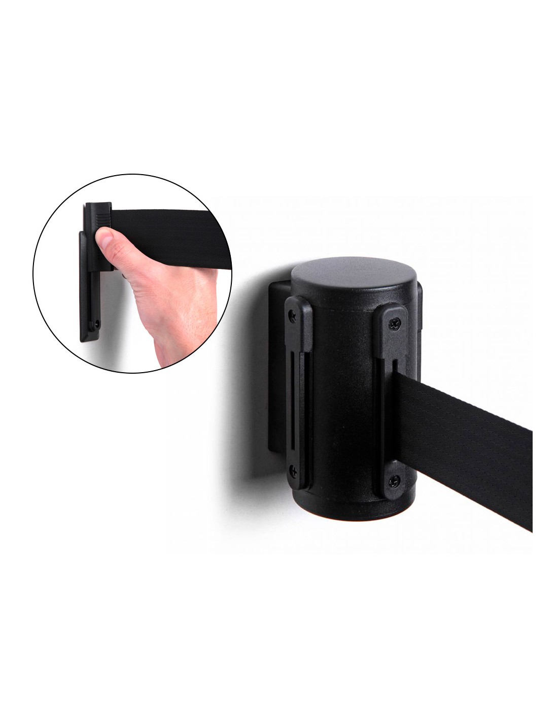 Mecanismo de barrera tensado montado en la pared con acabado negro y cinturón negro de 2 metros. Incluye un clip de recepción para sujetar el cinturón y poder instalarlo de pared a pared.